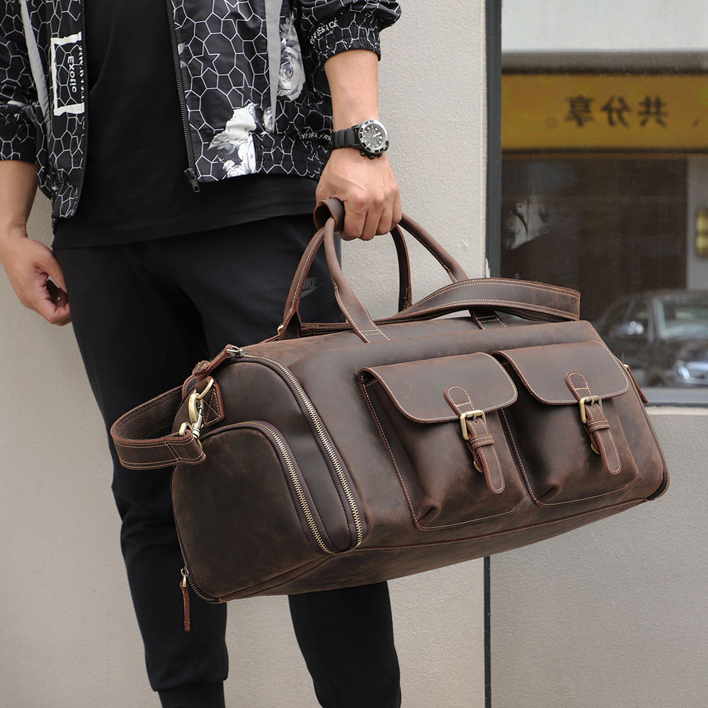 DUJIANG クレイジーホースレザー旅行バッグ 大容量 防水裏地 出張用荷物バッグ 折りたたみ式フィットネス旅行バッグ