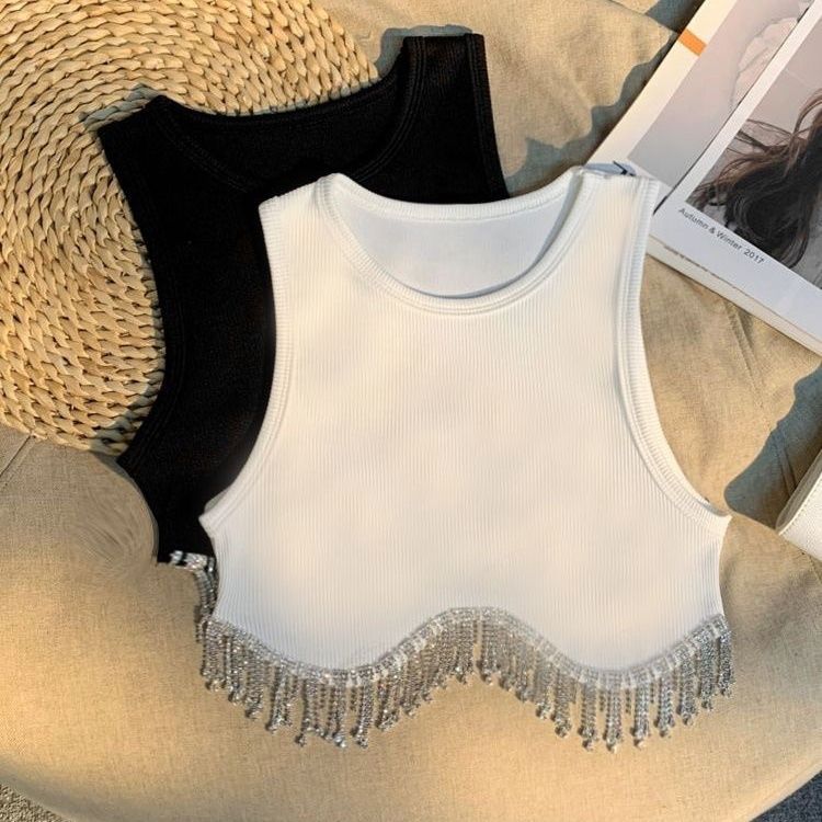 夏の新型の女の子のスパンコールの演出服のフリンジベストのサスペンダーの甘いダンスの腰の短い上着0214A029