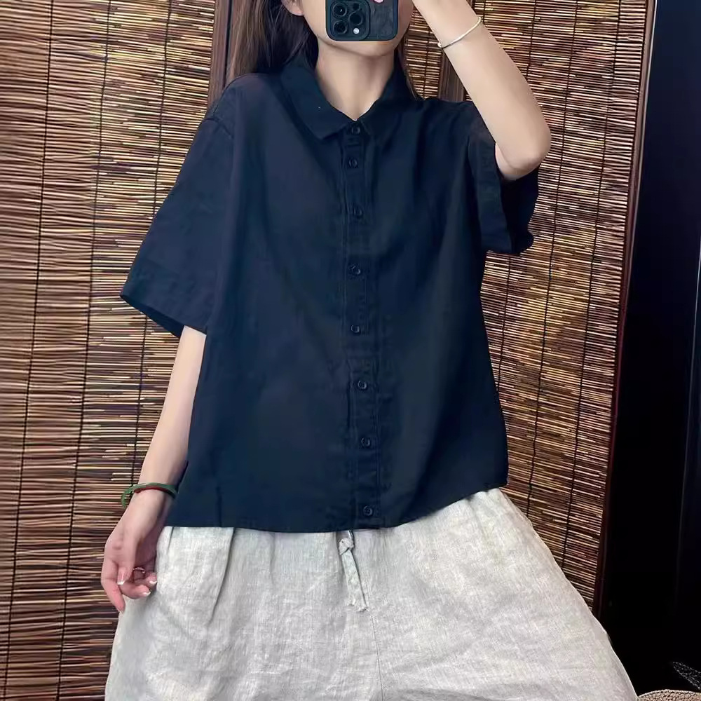 カジュアル通勤文芸レトロカジュアル半袖綿麻シャツ上着夏の新型vネックデザイン感女