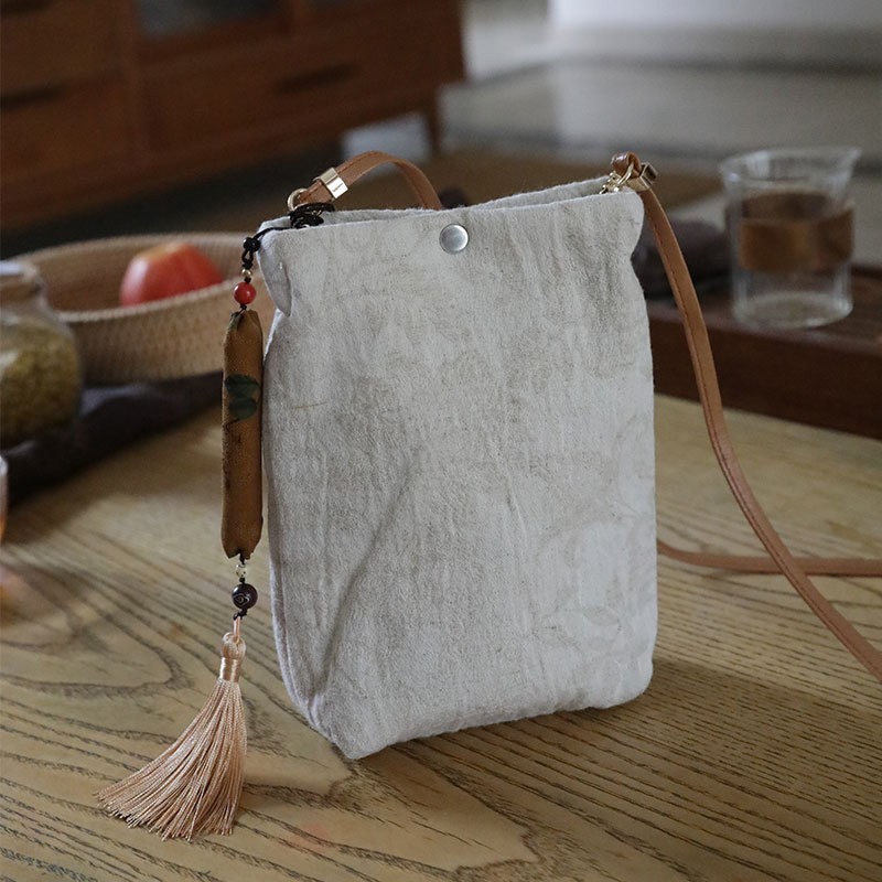 アーティスティックな綿麻製スマホバッグ、女性用斜め掛けキャンバスバッグ、ミニサイズ、和風、夏、縦型、軽量、シングルショルダー、バケツ型バッグ、多用途