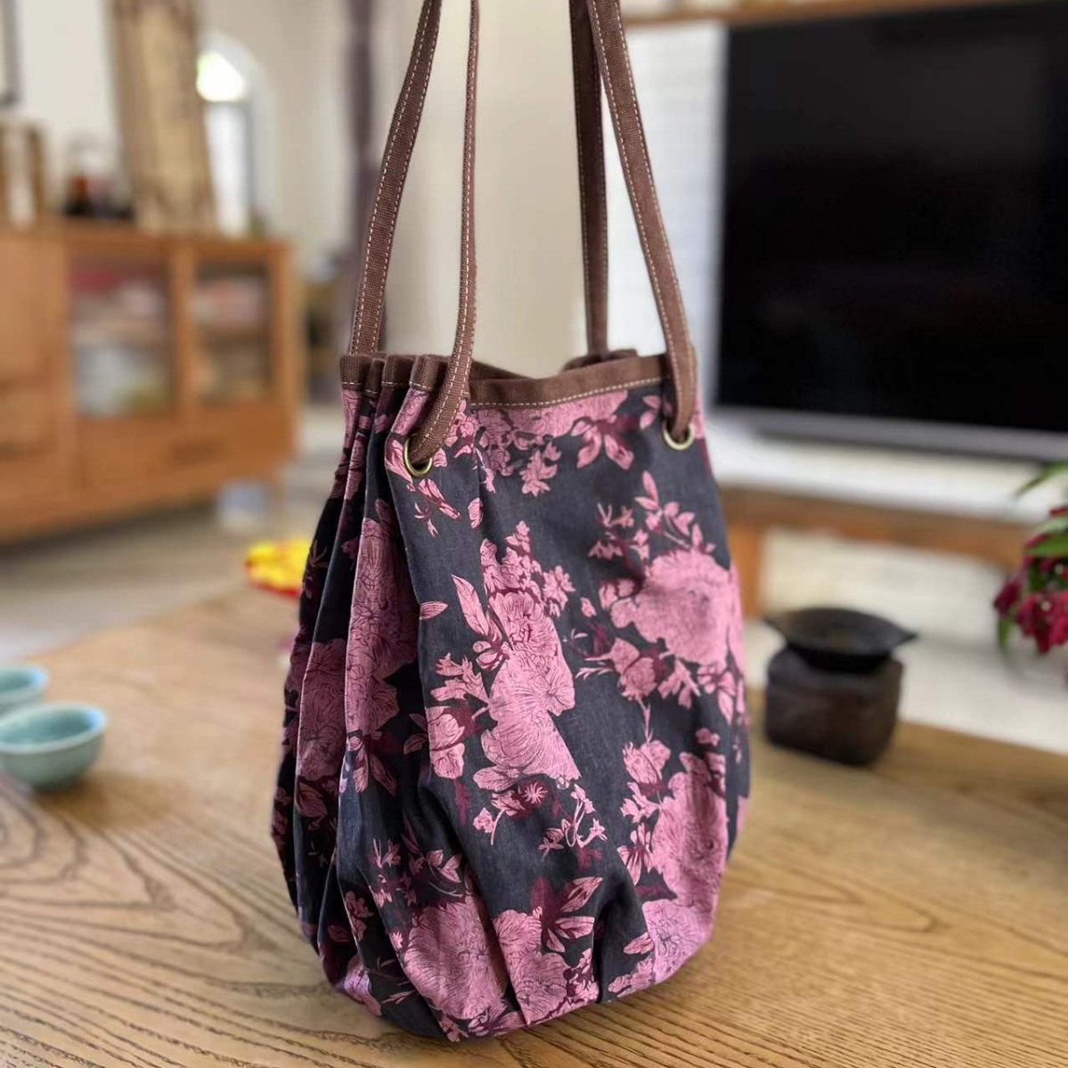 ファッショナブルな文学オリジナルコットンとリネンバッグカジュアルバケットプリントショルダー大容量レディースバッグレトロフローラルニッチバッグ