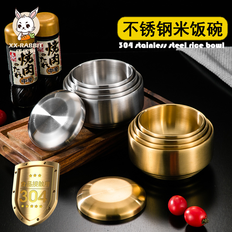 韓国式304ステンレスボウル金色蓋付き二重家庭用茶碗断熱防熱韓国料理焼肉茶碗