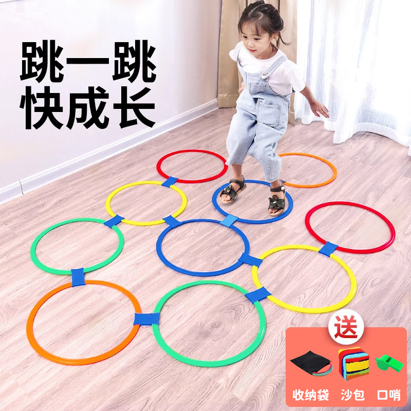 幼稚園の家の輪を跳んで子供の感覚を訓練します。