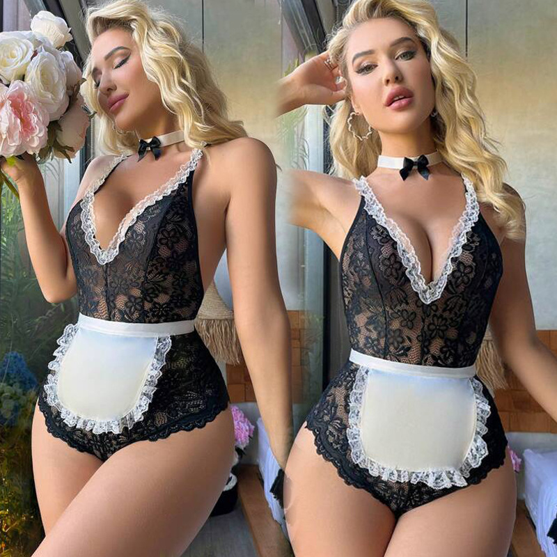 セクシーな女性のパジャマレースはメイドの制服セットを誘惑します。