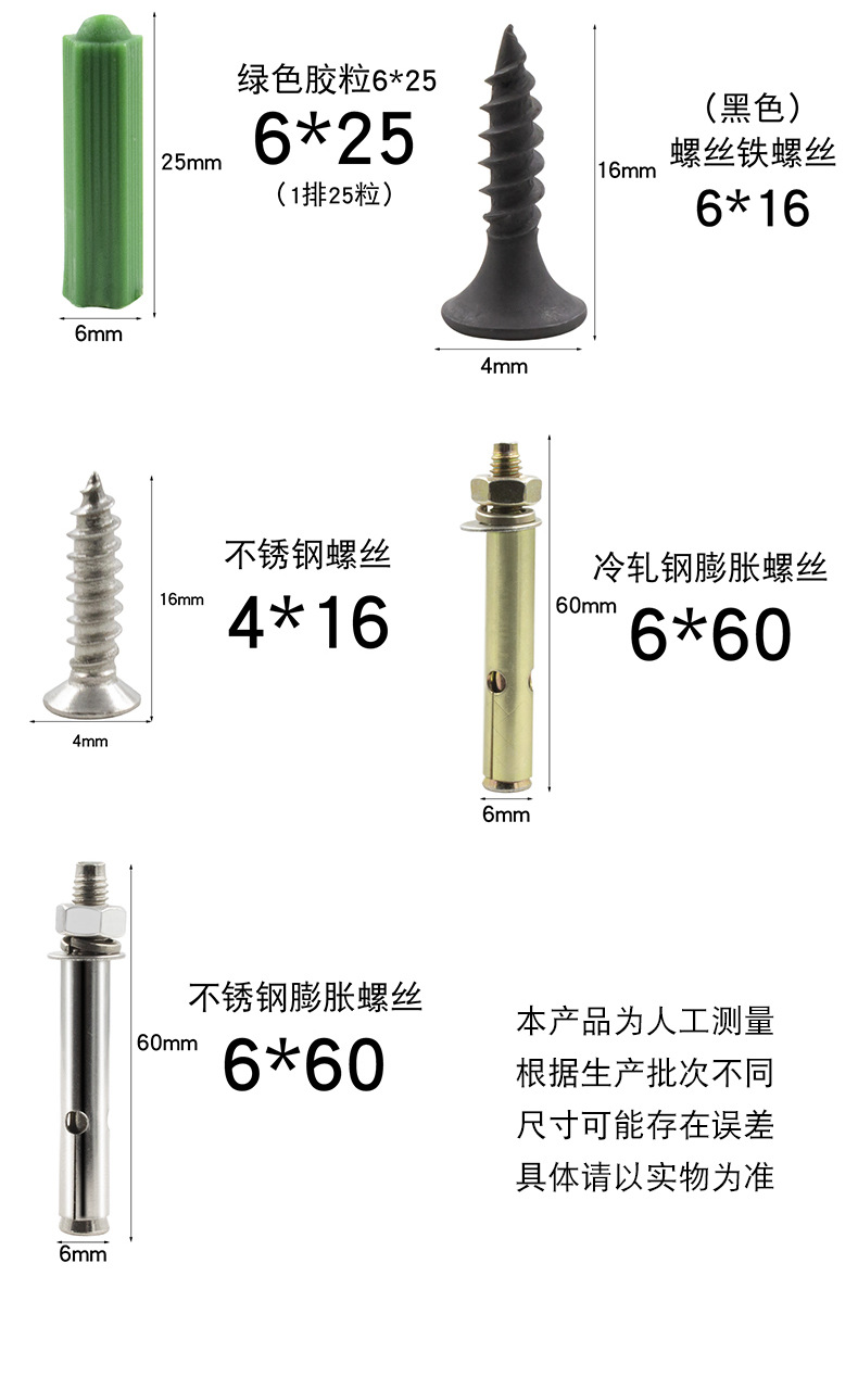 カラー ステンレス楕円形フック (45mm),ステンレス楕円形フック (60mm),ステンレス楕円形フック (80mm),ステンレス楕円形フック (100mm),黒い楕円形フック (60mm),黒い楕円形フック (80mm),黒い楕円形フック (100mm),ステンレス膨张ネジ (1粒入),鉄膨张ネジ (1粒入),ステンレスセルフタッピングねじ4*16(10粒入),ブラックタッピングネジ4*16(10粒入),壁に入る6センチの緑色のゴム粒(一列25粒)
