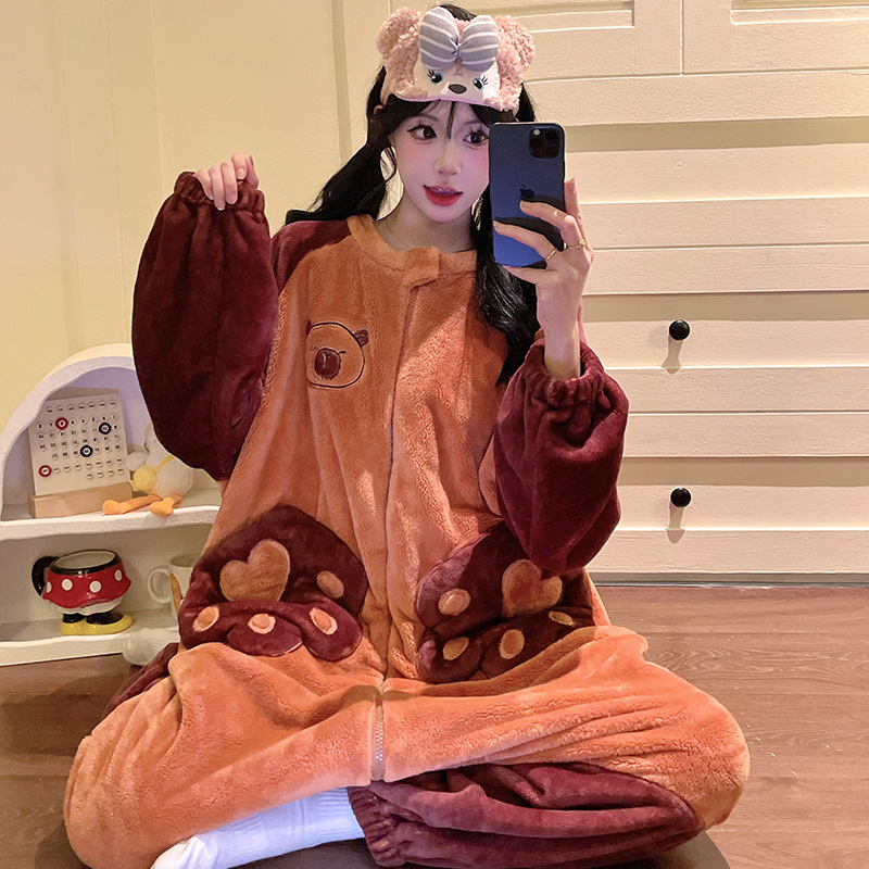 可爱卡皮巴拉法兰绒连体睡衣女冬季长袖拉链卡通保暖可外穿家居服
