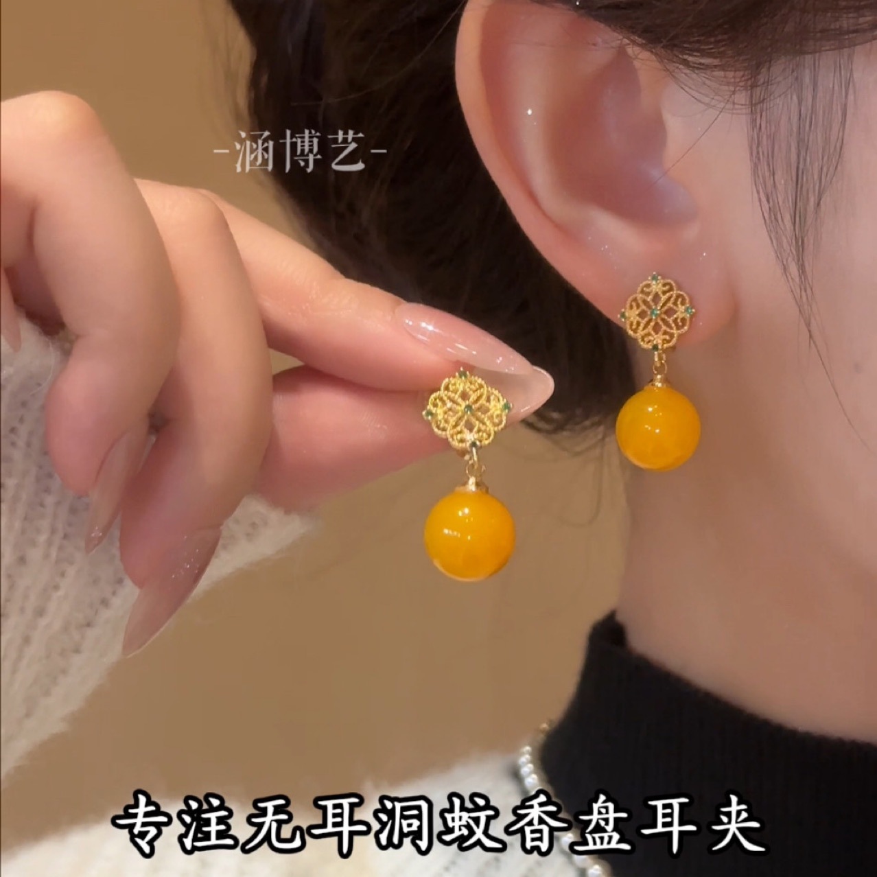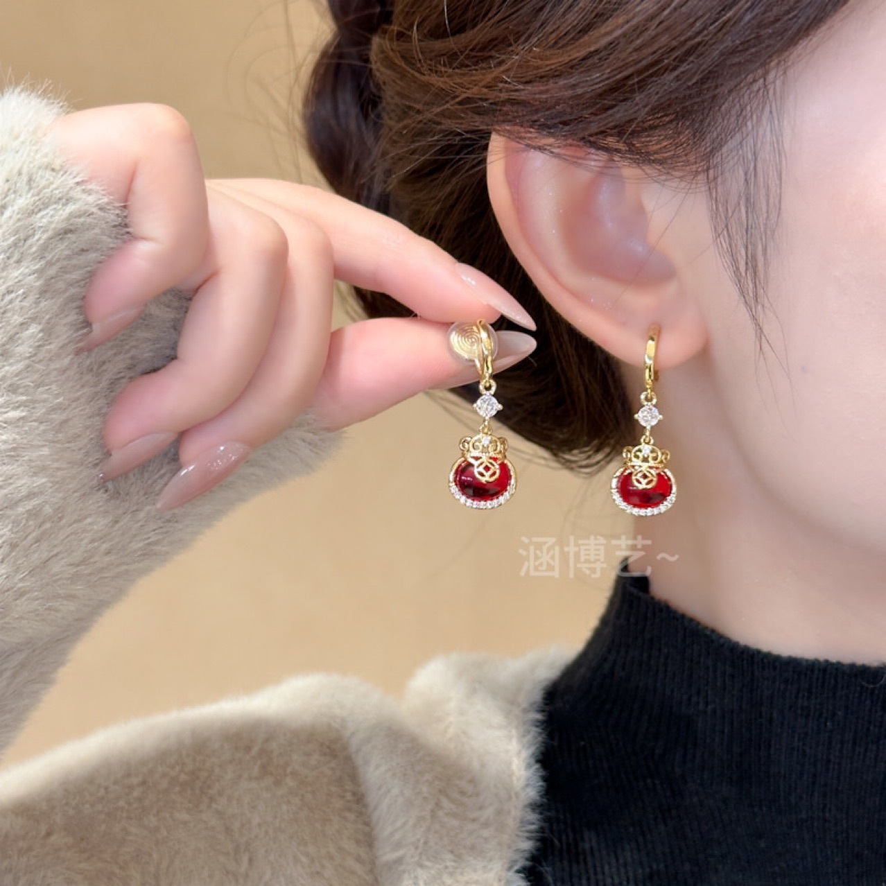 涵博艺镀真金福袋镶钻钱袋流苏耳夹气质轻奢独特高级感耳坠