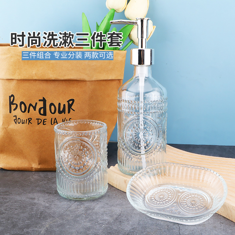卸売りのオーダーメイドの風呂のガラスの歯の杯の石鹸の皿のセットは包装を持って丸い手洗いの液体の石鹸の液体を押して瓶を分けます。