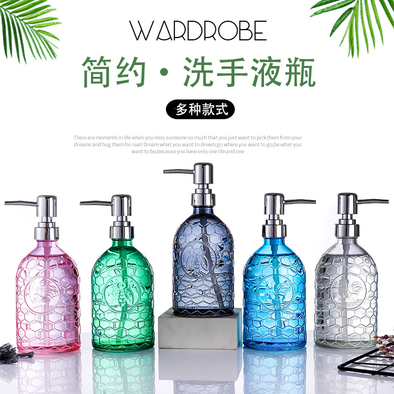 カラーレリーフ手洗い液瓶500mlガラス押し石けん液瓶ホテルシャンプー入浴剤分注瓶
