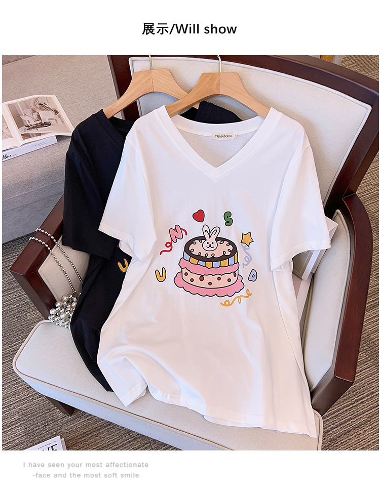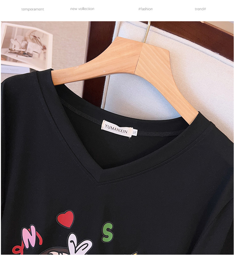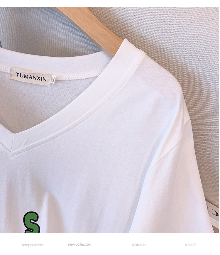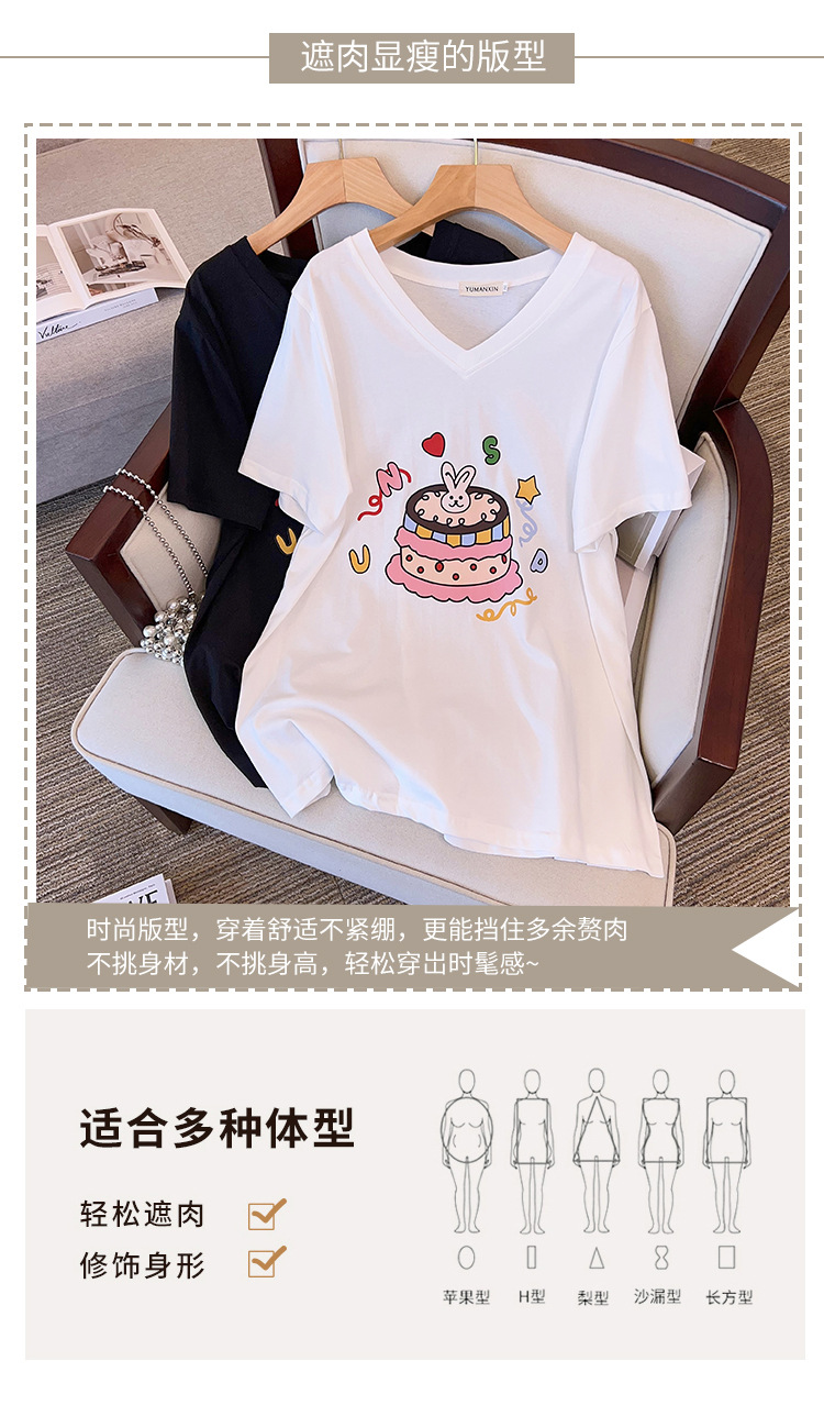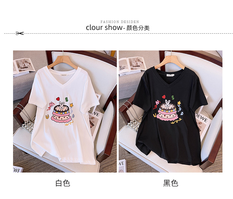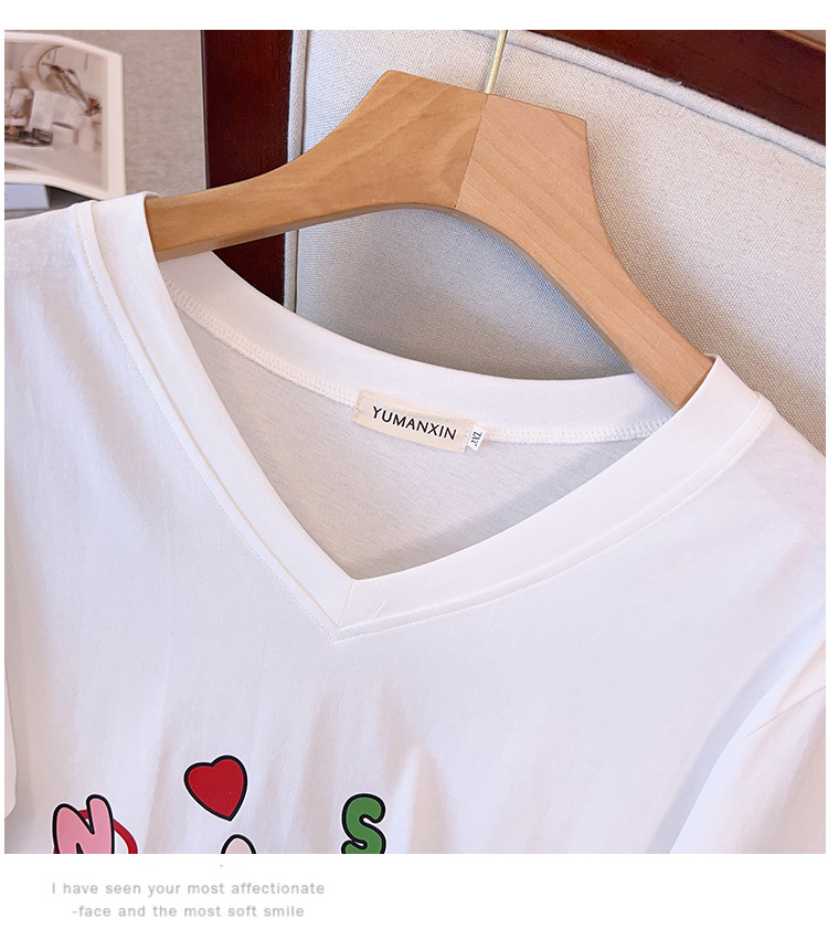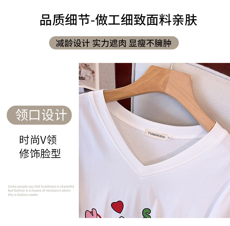 Vネックの新型加肥プラスサイズはやせてゆったりした中長の半袖tシャツの女性200/300/350斤6351