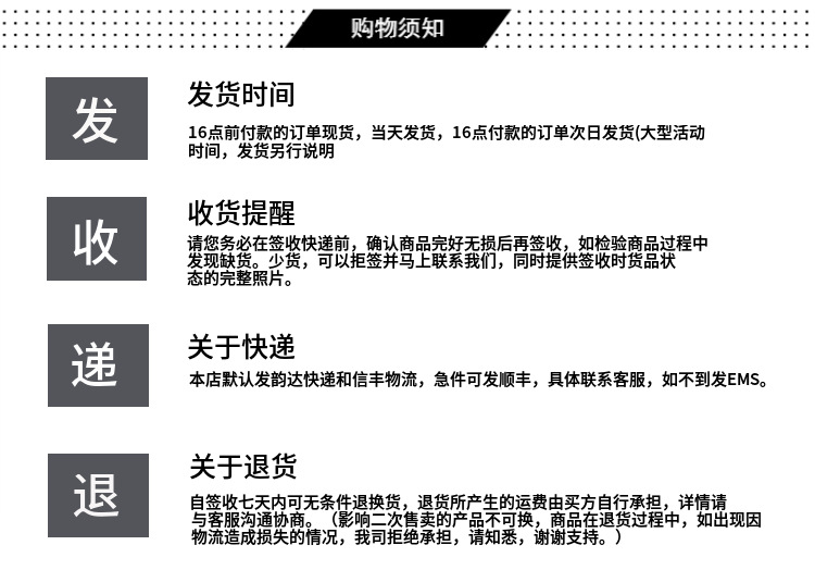美图王购买须知: 1、注意由于拍摄角度、光照的因素,可能会导致实物和图片有些不一样,请以实物为准 2、本店铺支持7天无理由退换服务,在签收之日起7天内可享 3、本店合作快递为申快递。默认发申通快递,如有不能到达的,地区或因其他特殊原因需要发其他快递,请主动联系我们客服更改,因更换快递导致价格成本提高,需要补上对应的差价, 具体需要跟客服协商。包邮产品除黑龙江、山西、青海、甘肃、吉林、内蒙古、辽宁,、宁夏、新疆等偏远地区和港澳需要加收运费,其他地区均免邮,详情请咨询旺旺客服。 4、产品均由仓库严格检查后打包出发,但避免产品在物流中途出现问题,请亲们收到产品先验收产品,确认产品完好无损,再签收,如产品有任何问题请先拒签,再第一时间与我们旺旺联系 5、我们致力于为客户提供优质快捷的快递服务,因快递公司与我们公司为合作关系而非我们公司直接经营,所以我们只承诺发货时间,无法对到货时间做出具体承诺;店内客服所提供的到货时间,都是我们依照过往经验所得,仅供客户参考!不能作为退款依据。
