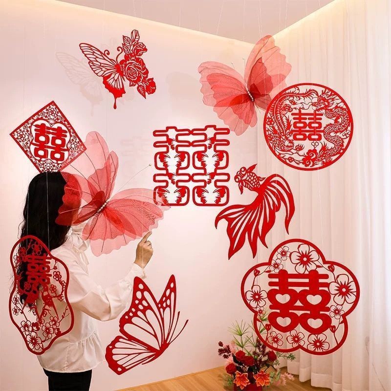 結婚用品の結婚部屋の装飾の大喜字の背景の壁のネットの赤い喜の玄関の窓の花の卸売りの直接販売の結婚式の配置
