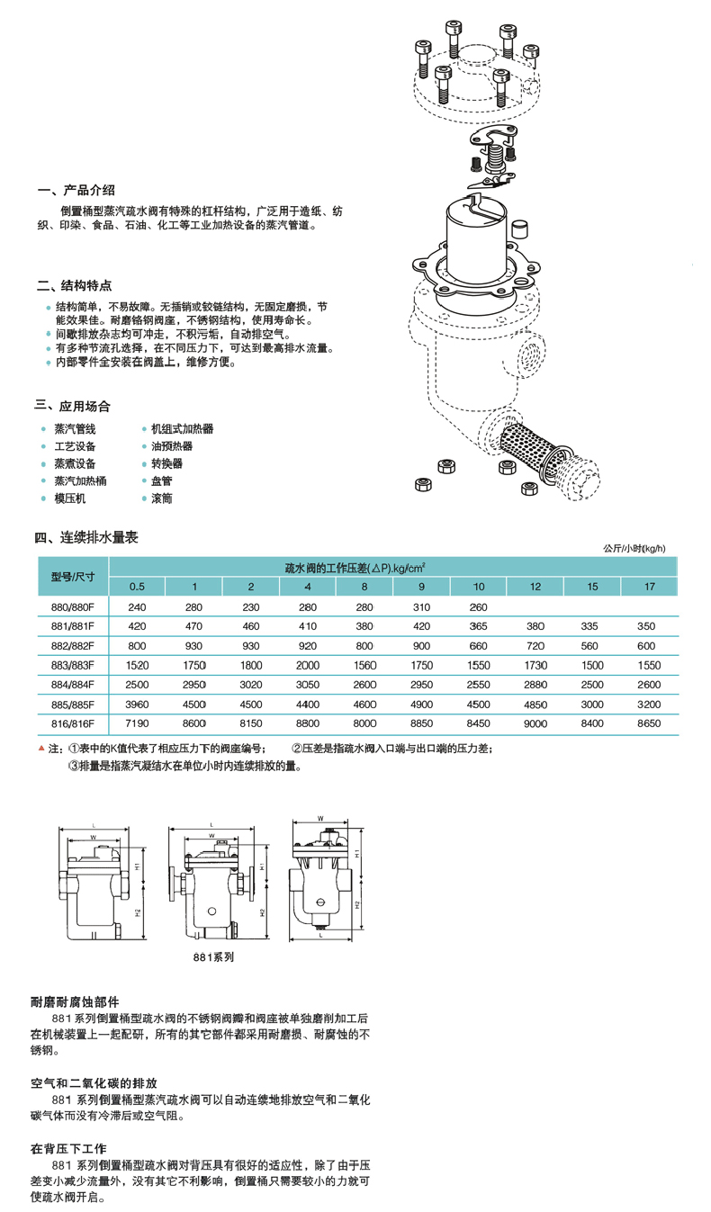 倒置桶型蒸汽疏水阀有特别的杠杆,广泛用于造纸、纺织、食品、石油、化工等工业加热设备的蒸汽管道。