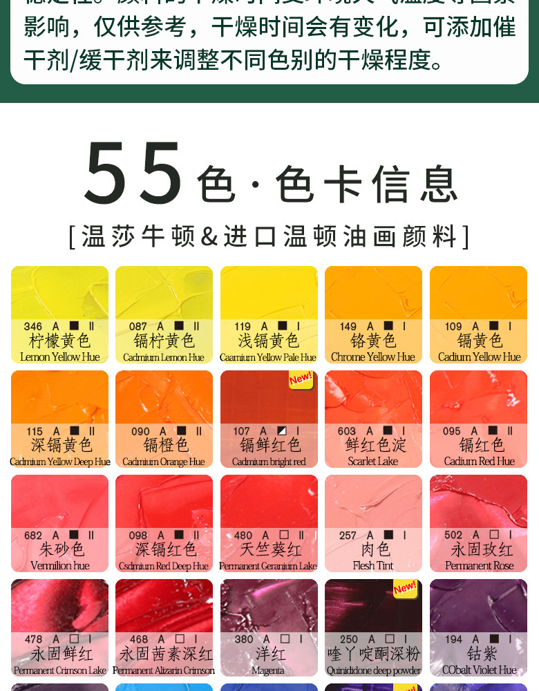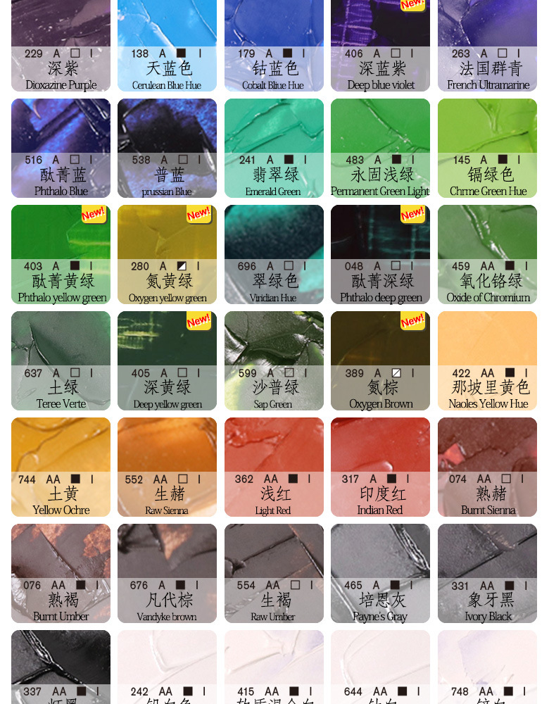 048 フタロシアニン ダークグリーン[透明],074 熟した黄土色【透明】,076 熟したブラウン[不透明],087 カドミウムレモンイエロー[不透明],090 カドミウムオレンジ[不透明],095 カドミウムレッド[不透明],098 ディープカドミウムレッド[不透明],107 カドミウム明るい赤色[不透明],109 カドミウムイエロー[不透明],115ディープカドミウムイエロー[不透明],119 ライトカドミウムイエロー[不透明],138 スカイブルー[不透明],145 クロムグリーン[不透明],149 クロムイエロー[不透明],179 コバルトブルー[不透明],194 コバルトパープル[不透明],229 ディープパープル[透明],241 エメラルドグリーン[不透明],242 リードホワイト[不透明],250キナリドンダークパウダー[透明],257 肌色[不透明],263 フレンチウルトラマリン【透明】,280窒素黄緑[不透明],317 インディアンレッド[不透明],331 アイボリーブラック[不透明],337 ライトブラック[不透明],346 レモンイエロー[不透明],362 ライトレッド[不透明],380 マゼンタ[透明],389 窒素ブラウン[透明],403 フタロシアニン黄緑[不透明],405 ダークパティナ[透明],406 ダークブルーパープル[透明],415 ソフトミックスホワイト[不透明],422 ナポリイエロー[不透明],459 クロムオキシドグリーン[不透明],465 ペイングレー[不透明],468 パーマネント アリザリン ディープレッド [透明],478 パーマネントブライトレッド[透明],480 ゼラニウムレッド[透明],483 パーマネントライトグリーン[不透明],502 パーマネントローズレッド[透明],516 フタロシアニンブルー[透明],538 プーラン[透明],552 ローオークル【透明】,554 ローブラウン[透明],599 シャープグリーン[透明],603 明るい赤色の沈殿物[不透明],637 アースグリーン[透明],644チタンホワイト[不透明],676 ファンダイブラウン[不透明],682 辰砂色[不透明],696 エメラルドグリーン[透明],744 カーキ[不透明],748 ジンクホワイト[不透明],よく使われる12色,よく使われる18色,よく使われる24色,よく使われる36色,よく使われる44色,よく使われる47色,新色8色,よく使われる48色,よく使われる52色,よく使われる55色