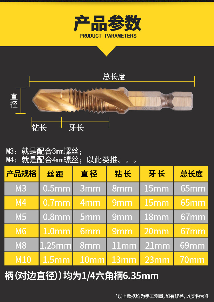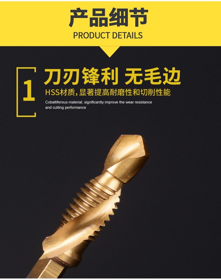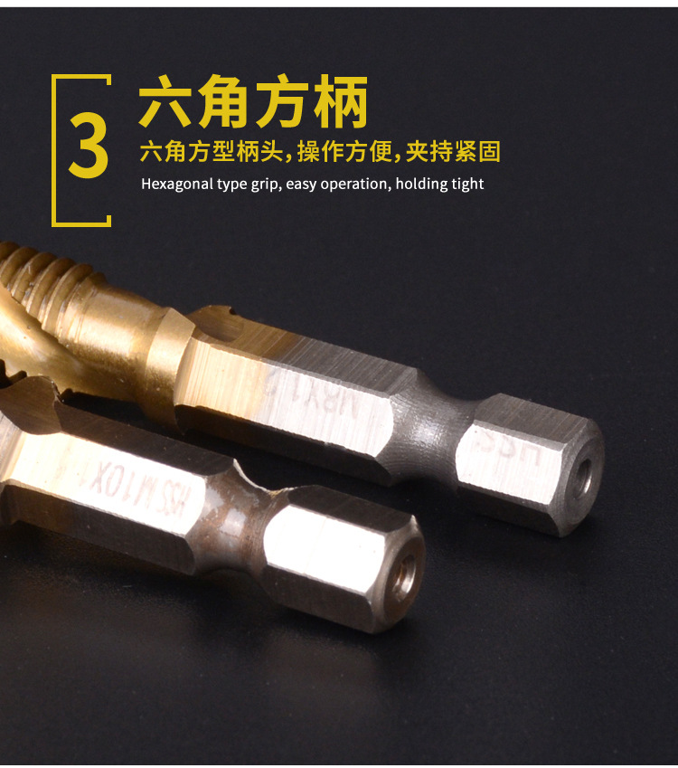 六角ハンドルスリーインワン複合タップ、ドリル、タッピング、面取り一体型スパイラルタッピングタップ