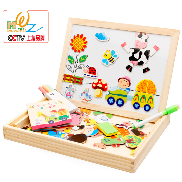 子供知育玩具磁気木製パズルボード磁気動物多機能両面ボードパズル