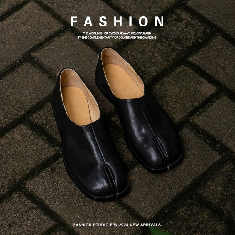 牛革版!英国風2025レトロスプリットトゥシューズ、フラットソール豚蹄型シングルシューズ、レディーススリッポン、楽ちんレザーシューズ