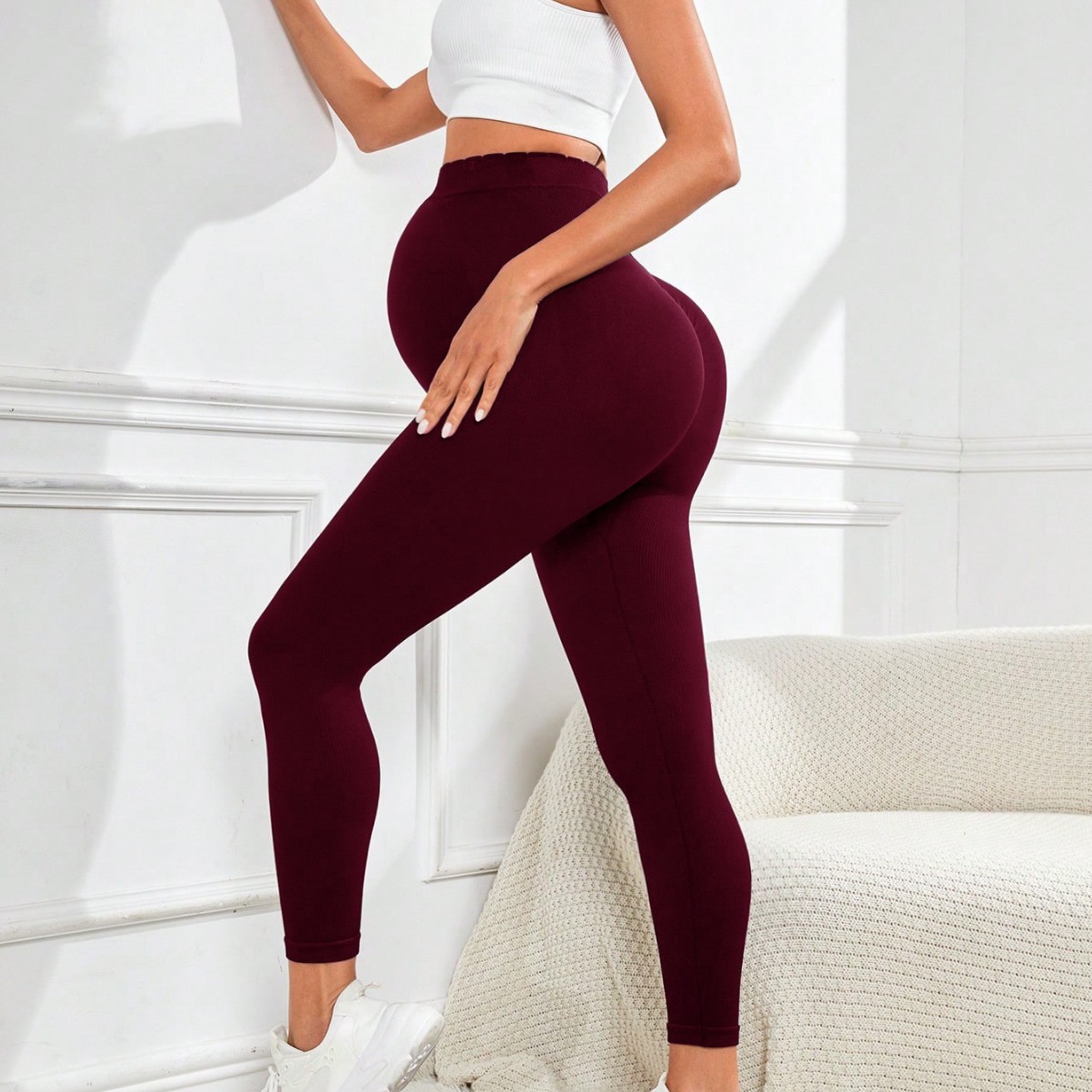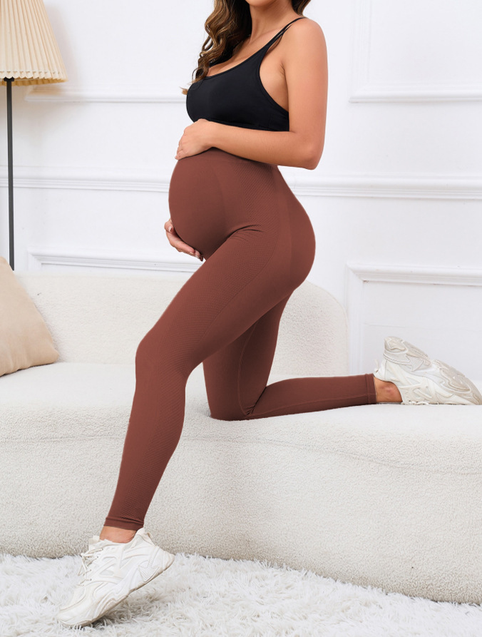 2025年新作、コーヒー色の妊婦用レギンス。妊娠初期のお腹をサポートするハイウエストで、伸縮性があり速乾性で、お腹を締め付けないロング丈のマタニティパンツです。
