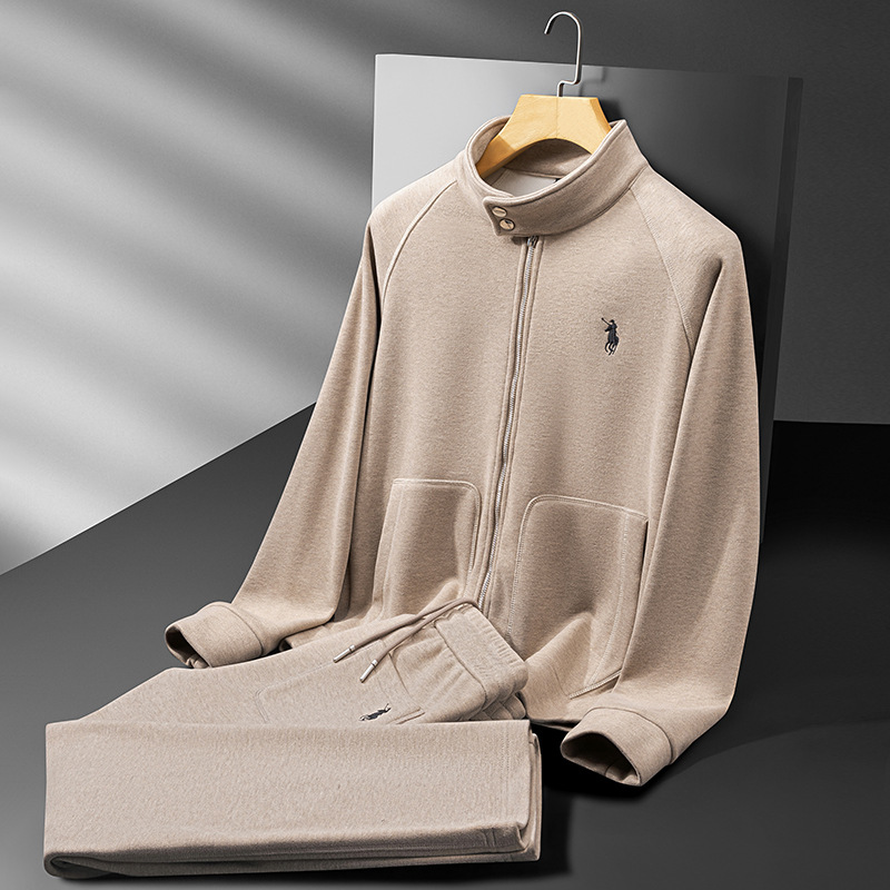 冬季加绒加厚羊毛呢休闲套装男高端老钱风宽松羊毛混纺立领外套男