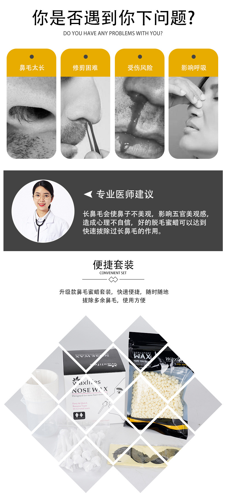 スポット鼻毛ワックス豆ひげ抜き鼻毛専用ワックス脱毛ワックス男性女性鼻毛ミツロウ棒部品セット