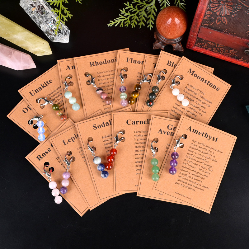 跨境天然水晶圆珠钥匙扣七彩水晶石三珠扣瑜伽石钥匙扣挂件套盒