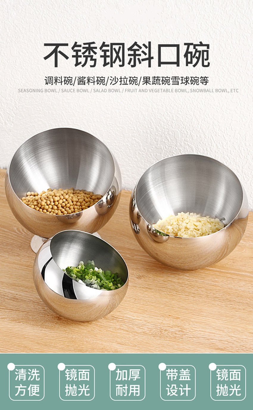 ステンレスの厚い斜めの口の碗の火鍋の店は調味料の碗の果物のサラダの碗のホテルのバイキングの調味料の碗を調整して多く使います。