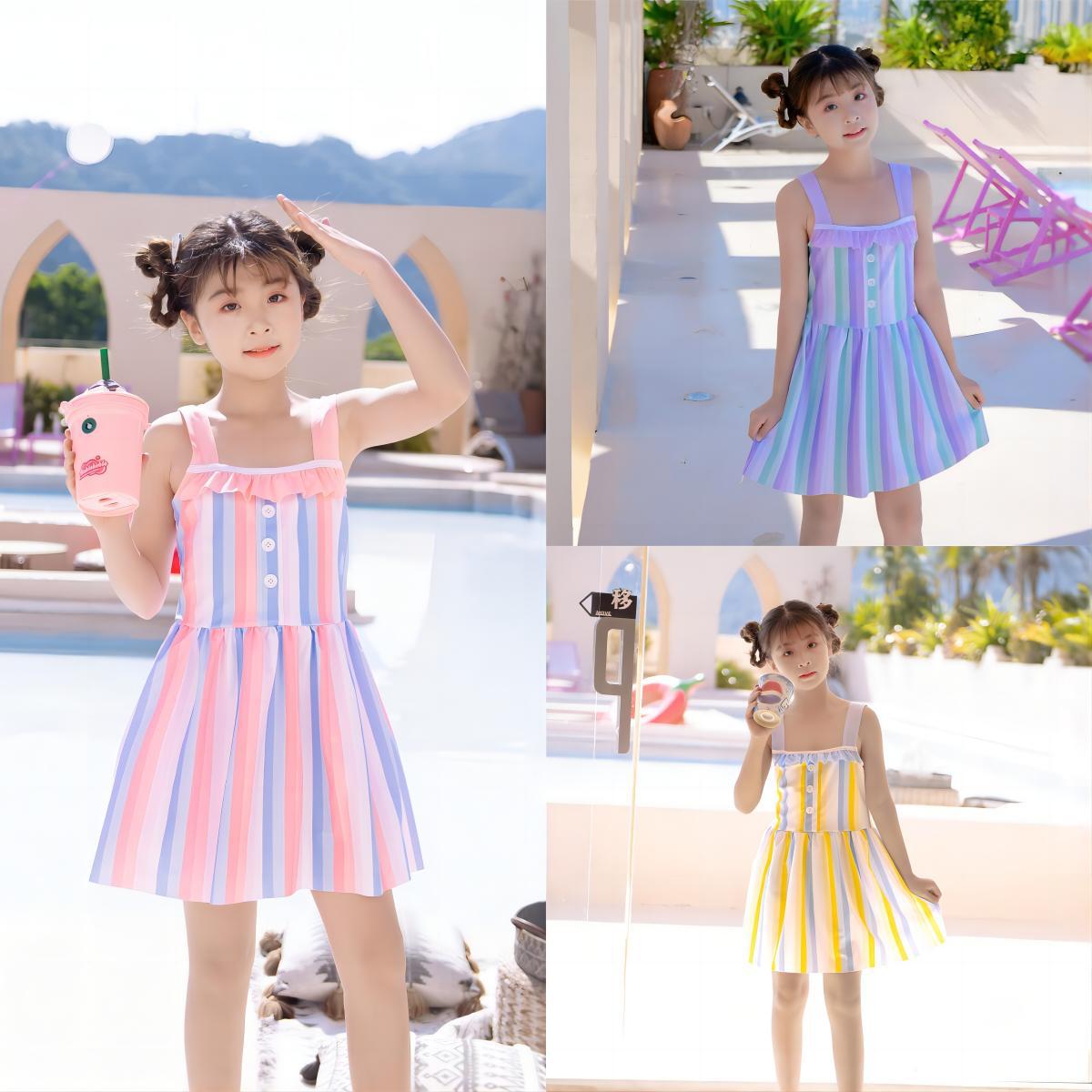 女の子用水着、中型および大型子供用ワンピース水着、四角い、甘くてかわいい、カラーブロック、温泉休暇、子供用水着卸売