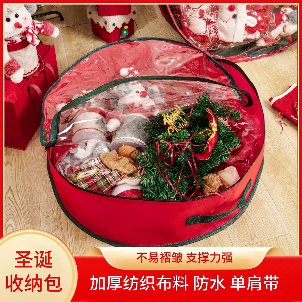 跨境圣诞收纳袋大容量PE花环圆形收纳包拉链防尘圣诞节礼物整理袋