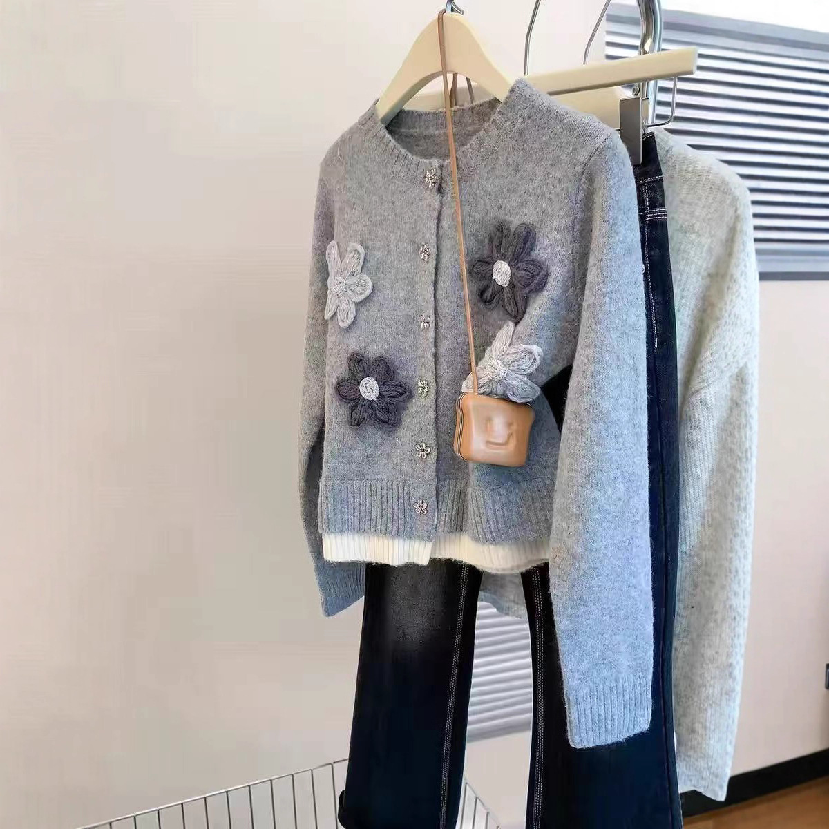哥家商场同款女装2025灰色软糯针织开衫毛衣外套女设计感小众上衣