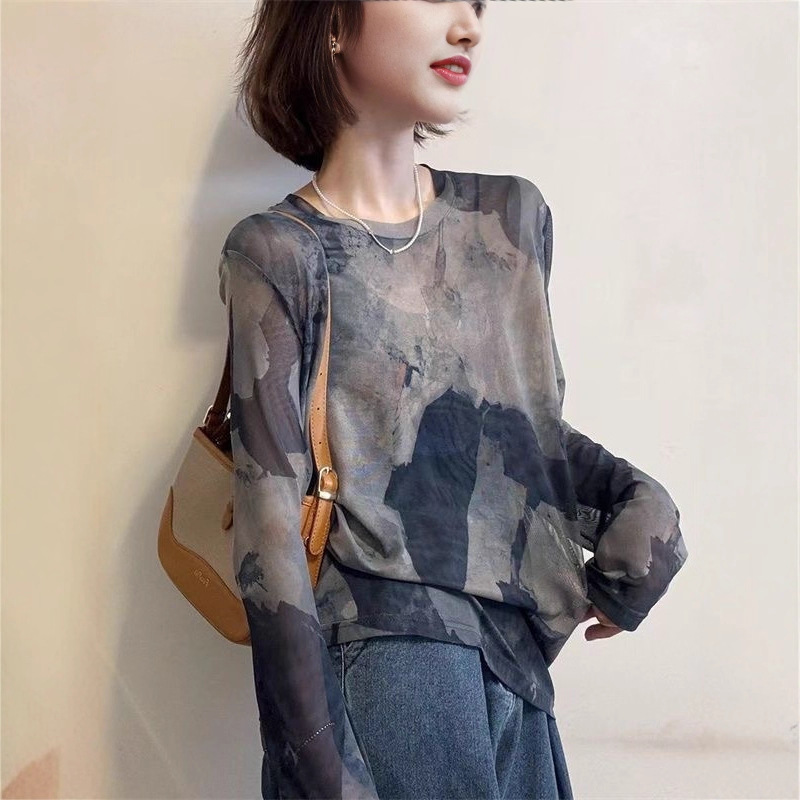 哥家商场同款女装2025秋季复古印花网纱晕染水墨长袖防晒衫t恤