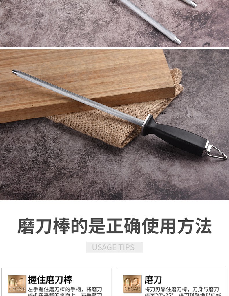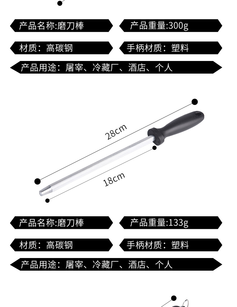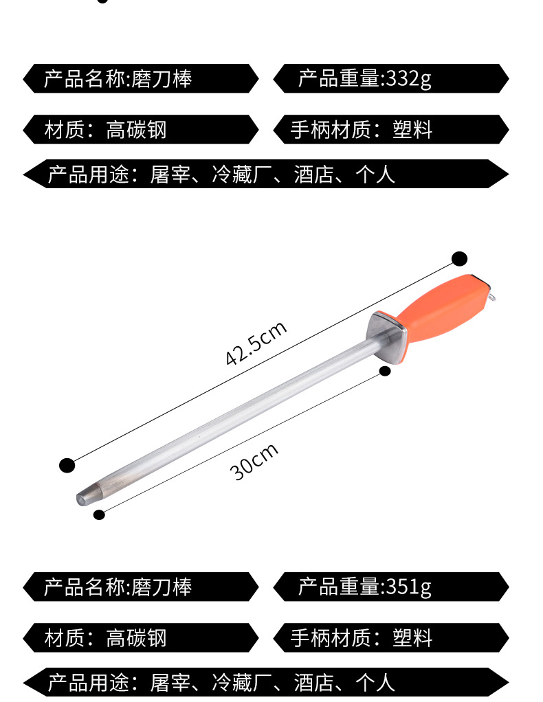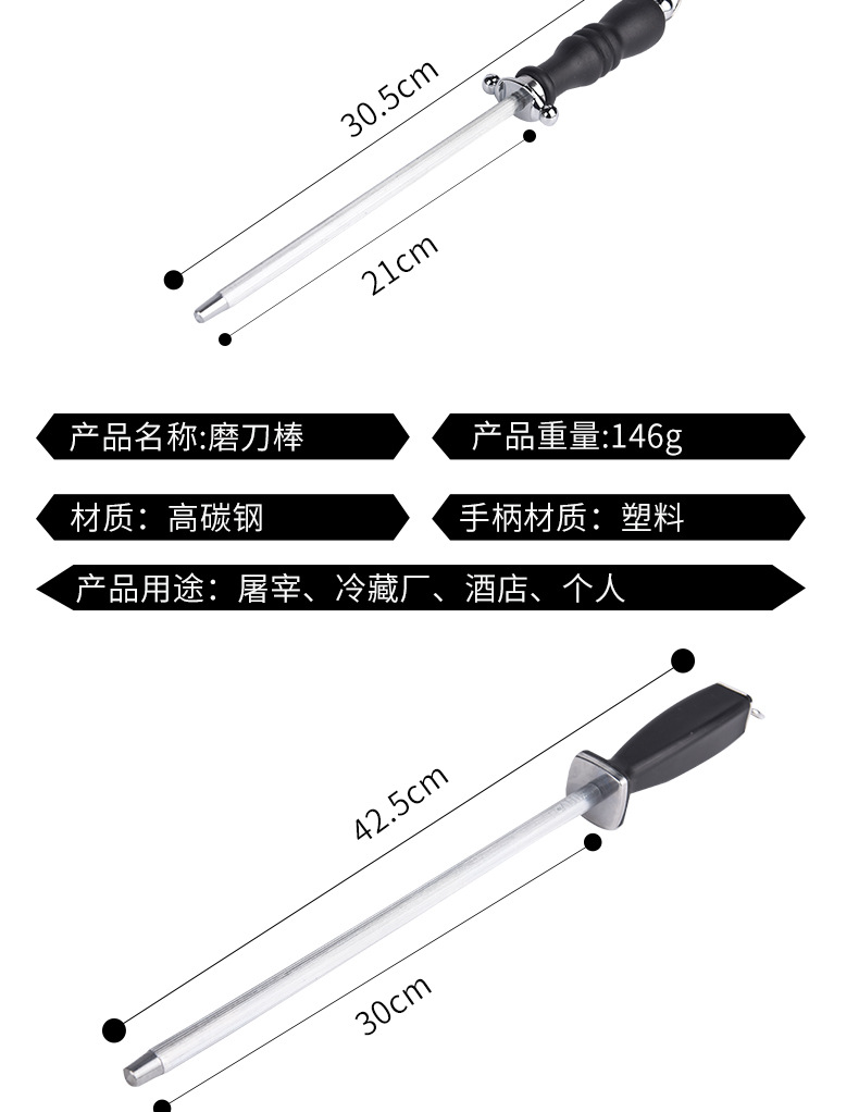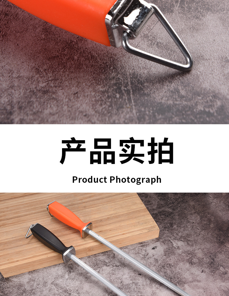 厨房工具多规格屠宰场磨刀棒可悬挂易清洗塑料PP握柄不锈钢磨刀棍