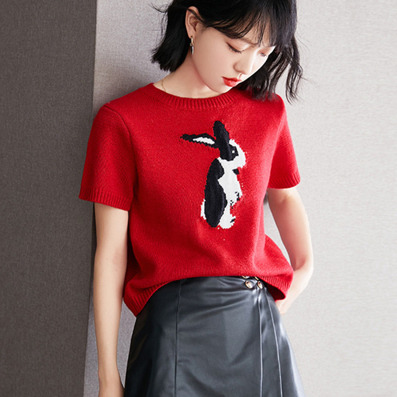 Gejia 新 2024 春夏赤半袖 Tシャツウサギ年齢軽減刺繍アイスシルクセーターセーターレディーストップ
