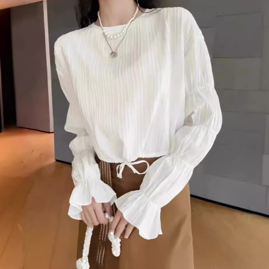 2024年春夏新作、シワ加工で着痩せ効果のある、オフィス向けの白いポロ襟シャツ。通勤にも使える上品な女性用トップス。