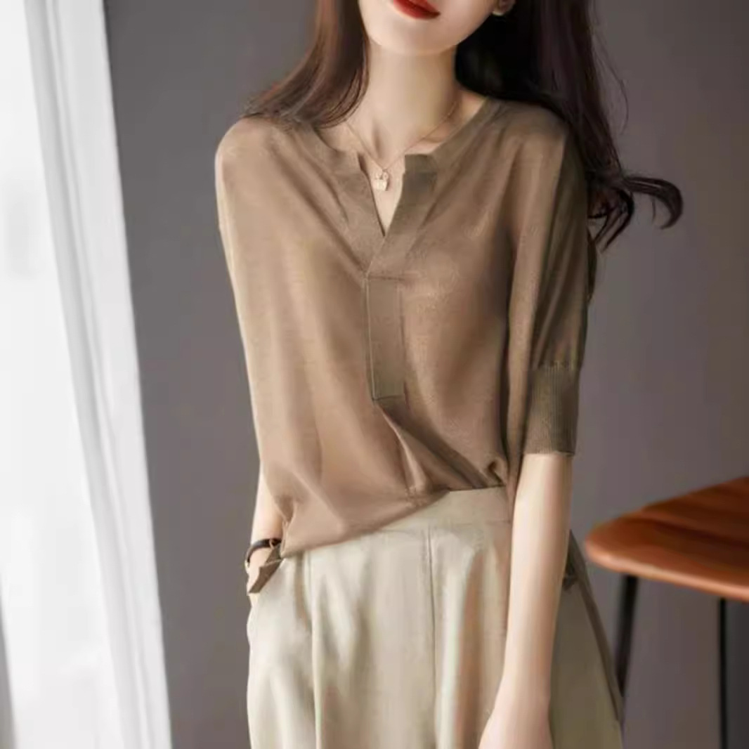 Ge's の新しい 2024 夏アイスシルク 5 分袖 V ネックセーター女性の薄い半袖 T シャツ 5399480