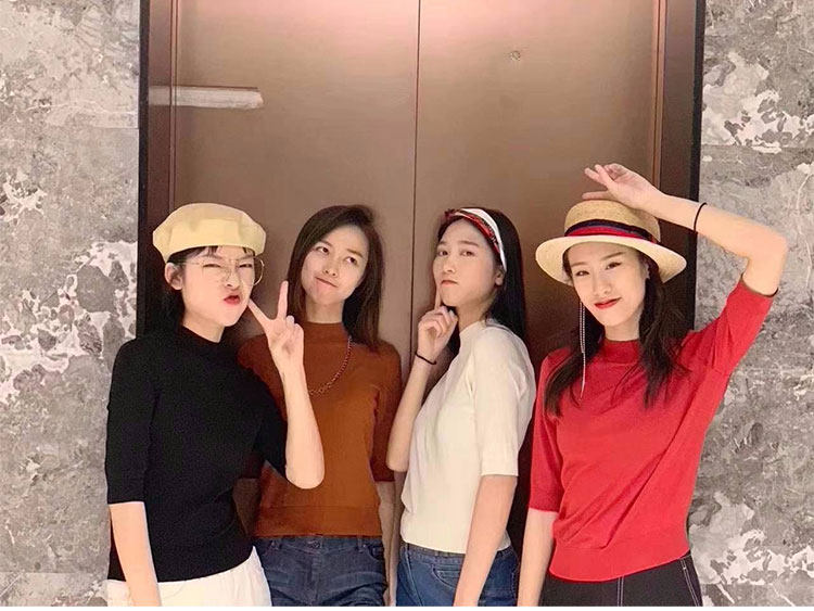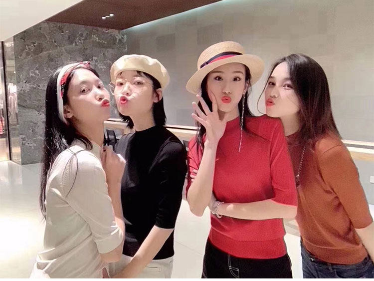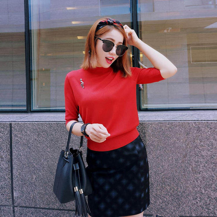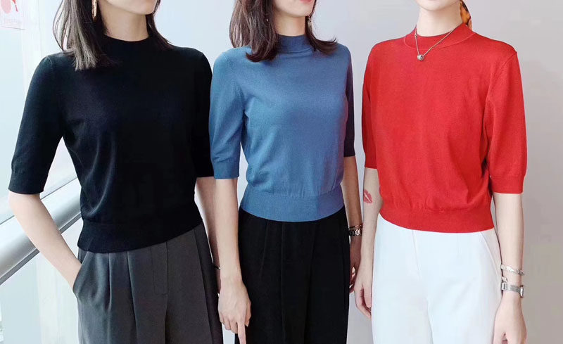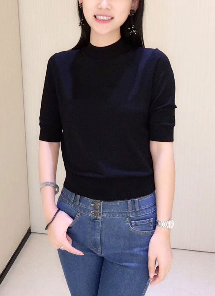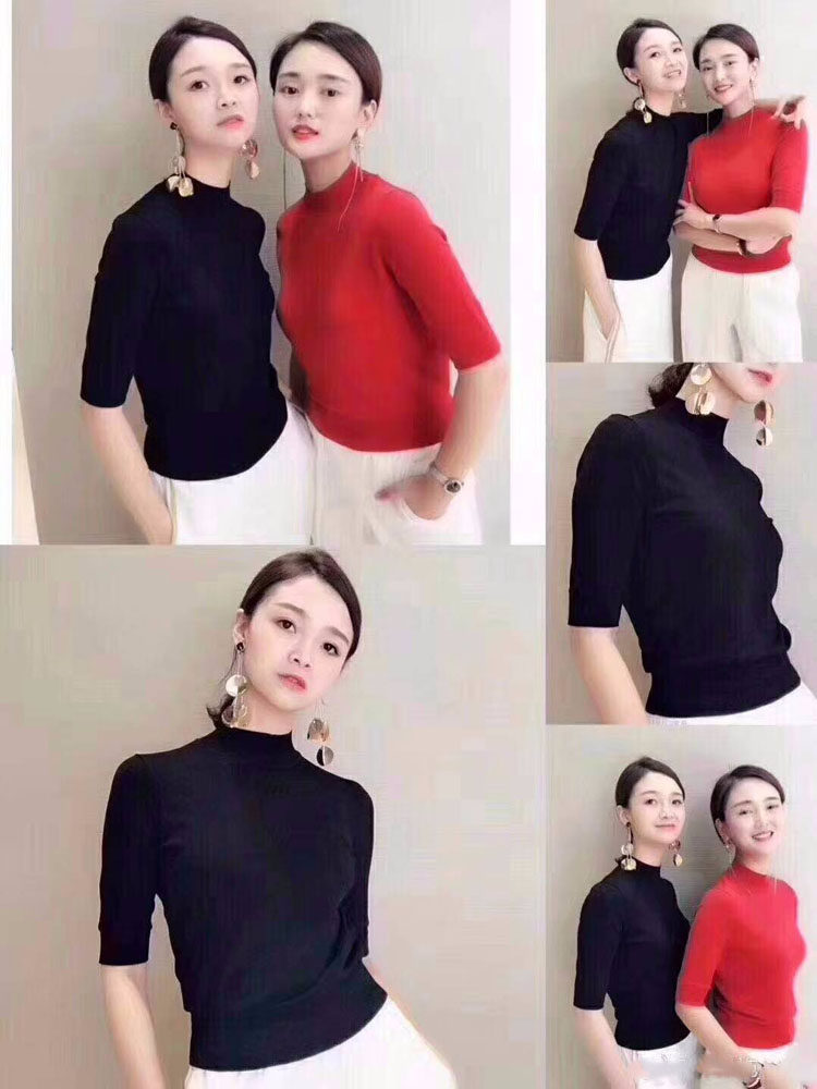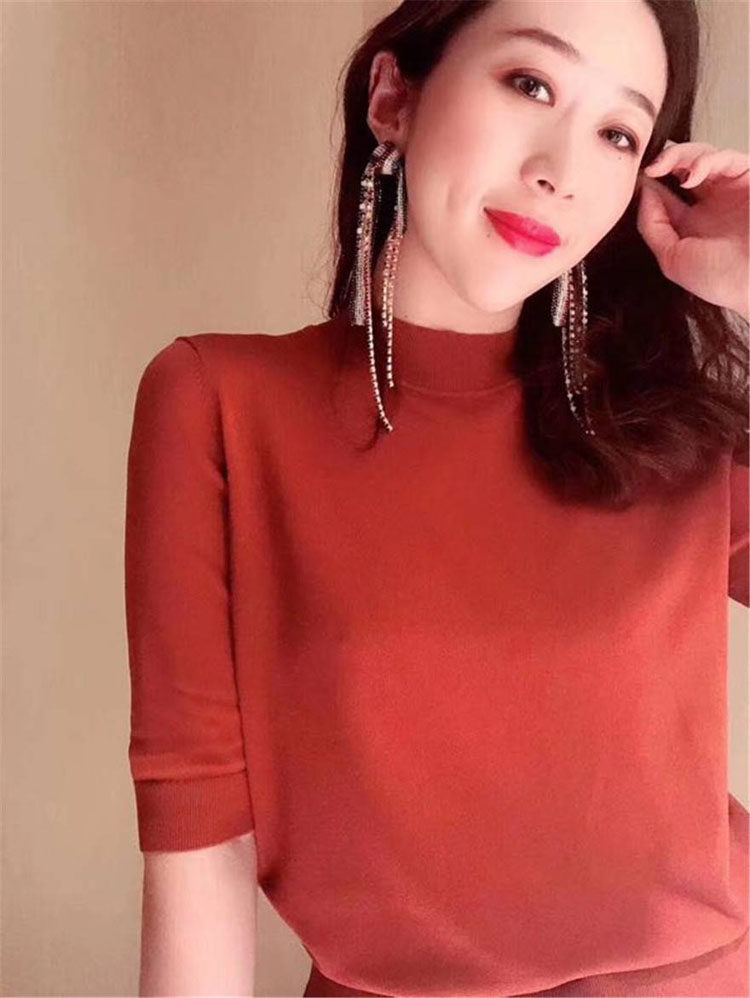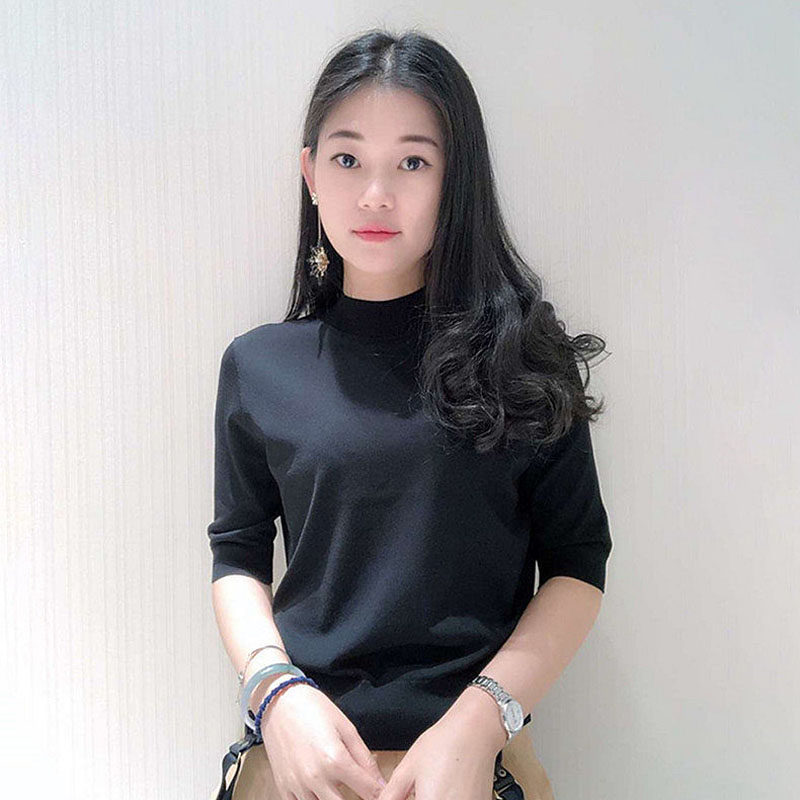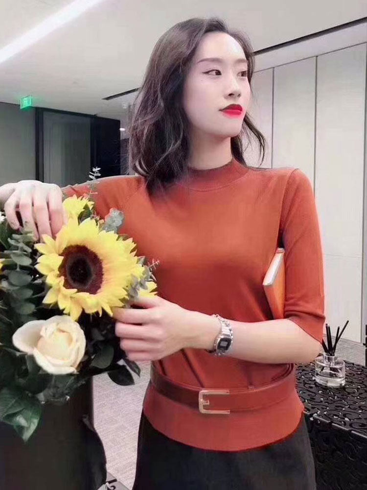 Ge の新 2024 夏ソリッドカラースリムフィットハーフタートルネック女性のアイスシルク七分袖ボトミングセーター Tシャツ