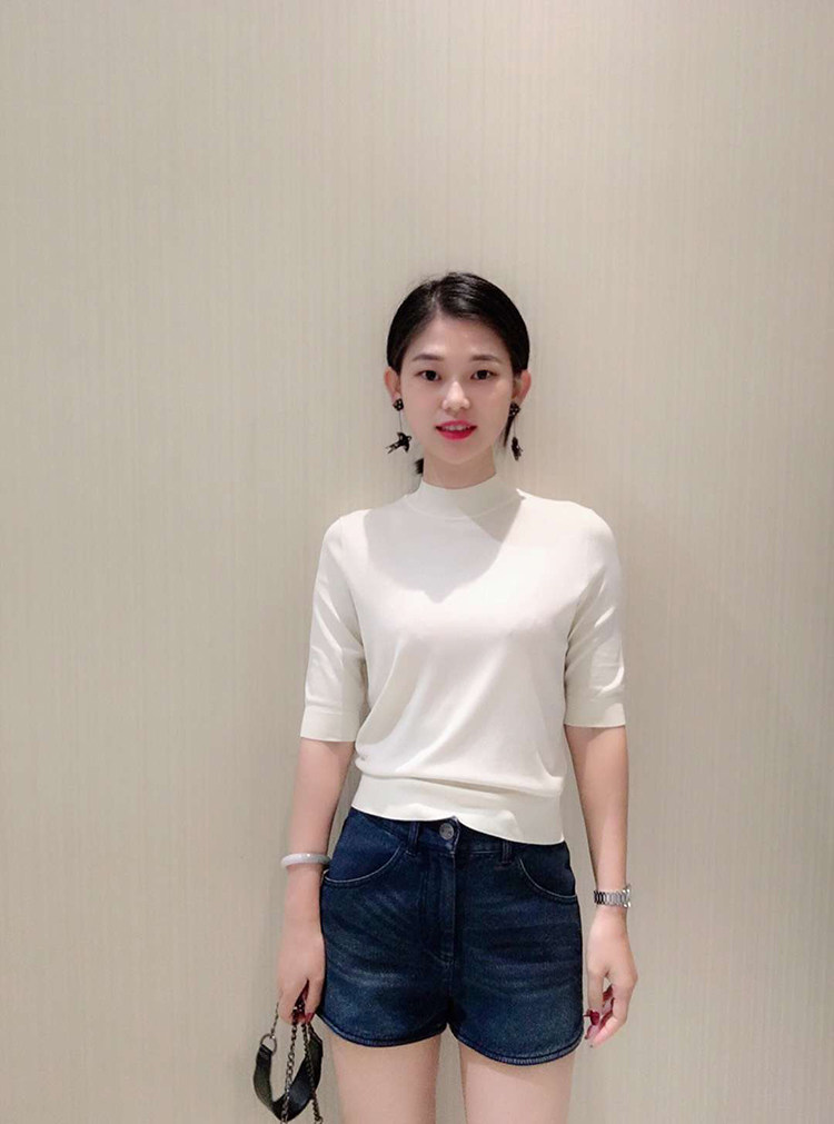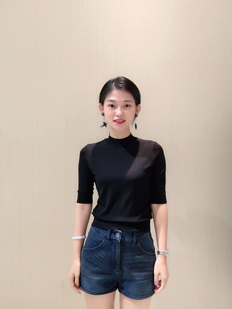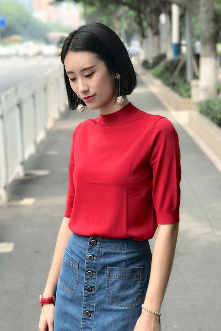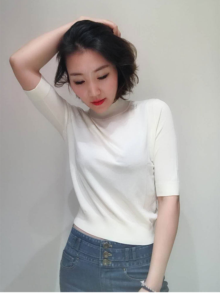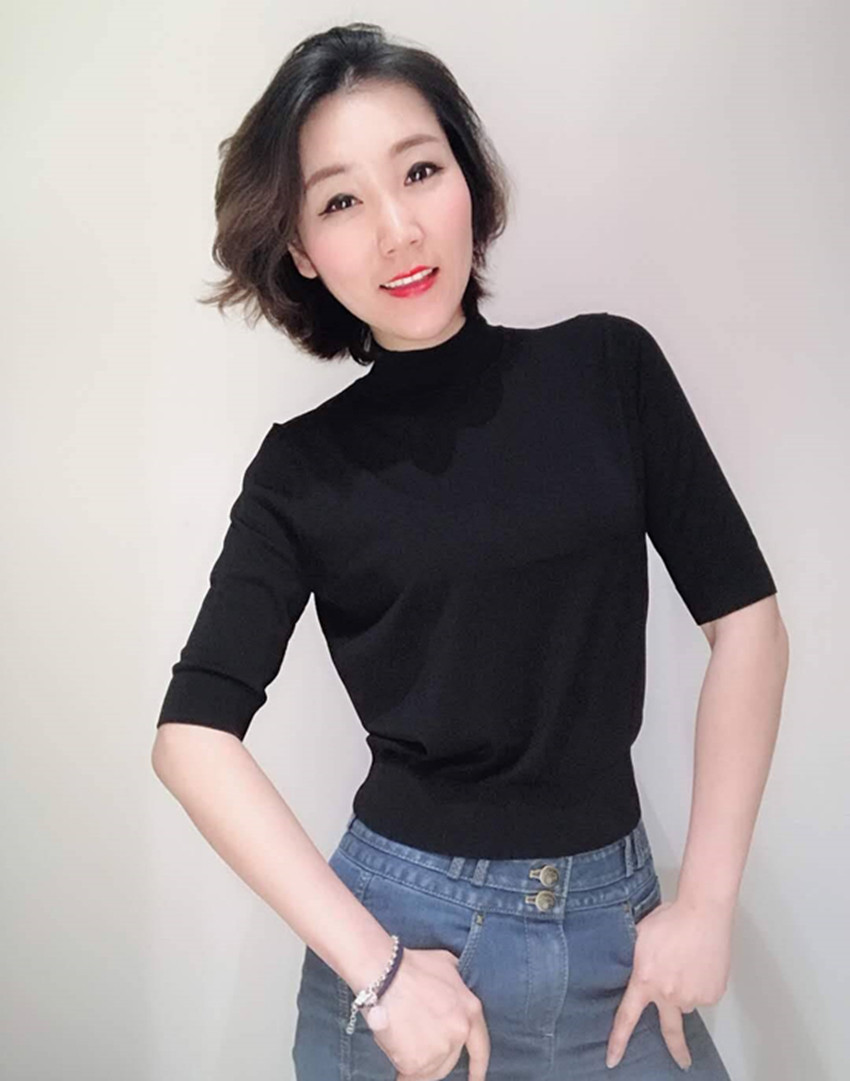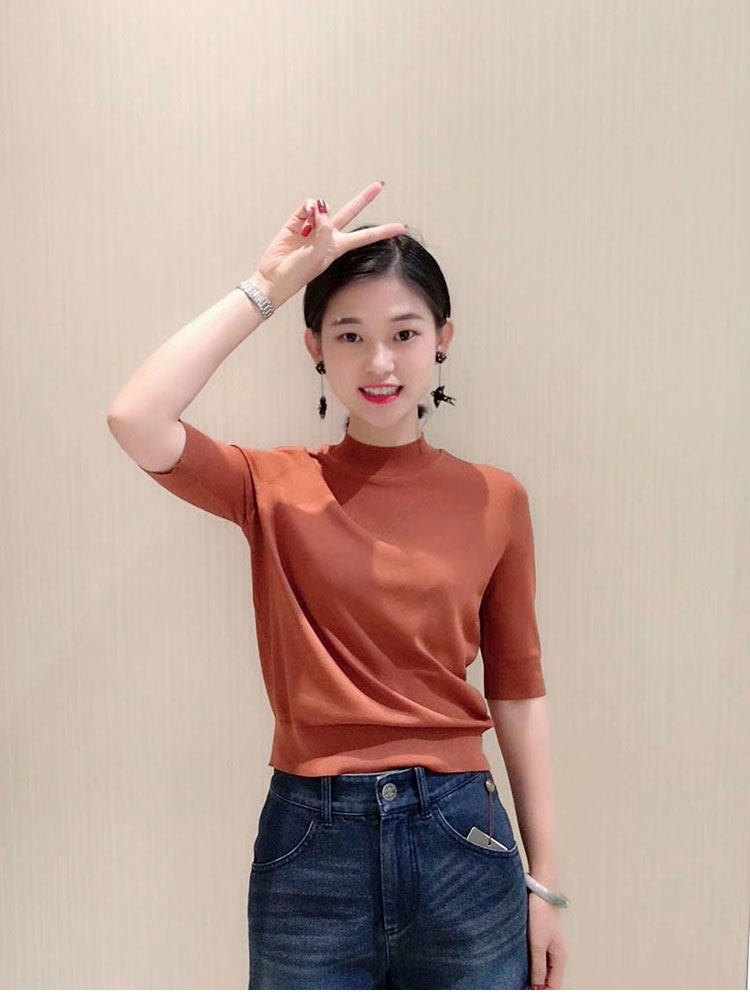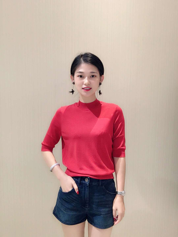 Ge の新 2024 夏ソリッドカラースリムフィットハーフタートルネック女性のアイスシルク七分袖ボトミングセーター Tシャツ