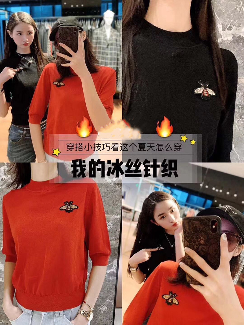 Gejiaショッピングモールの2024年夏新作Little Beeラウンドネックスリムフィット刺繍セーター半袖Tシャツトップ
