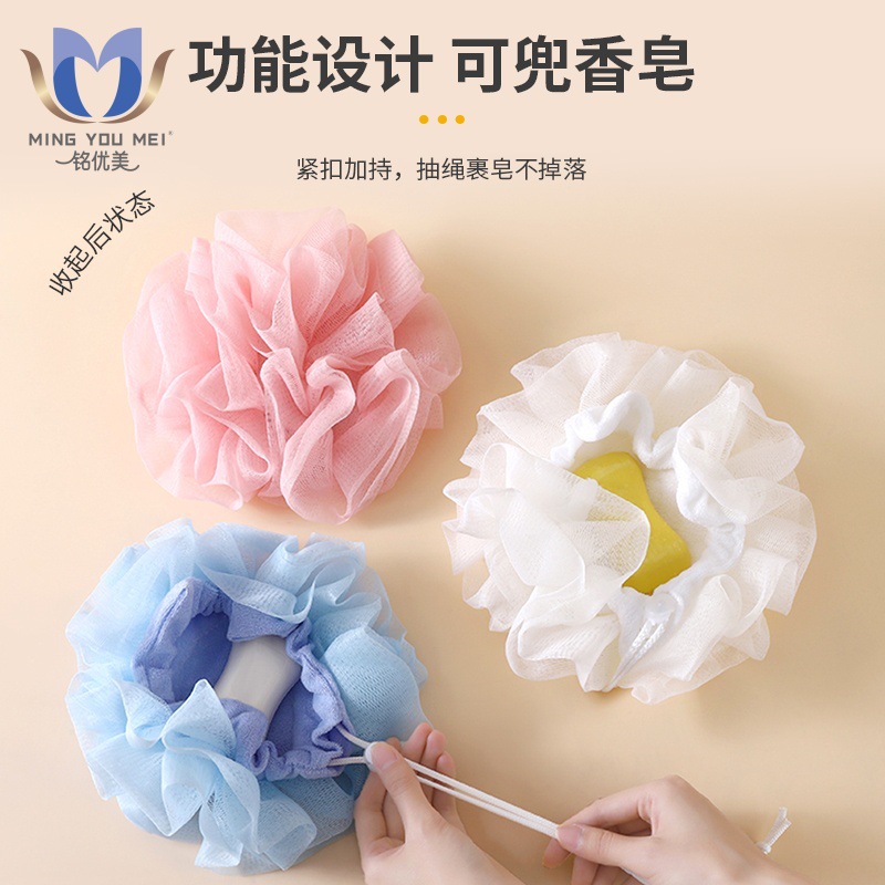 新しいバスボールは花が飛ばされず、石鹸バスボールを置くことができます。バスルームの厚い泡たっぷりの背中こすり泡ネット石鹸です。