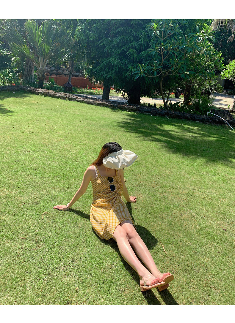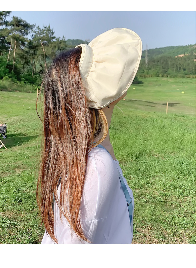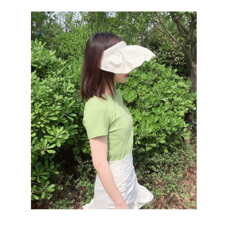 黒ゴムの大きなつばの空の帽子の女性は夏に自転車で日よけ運動をします。