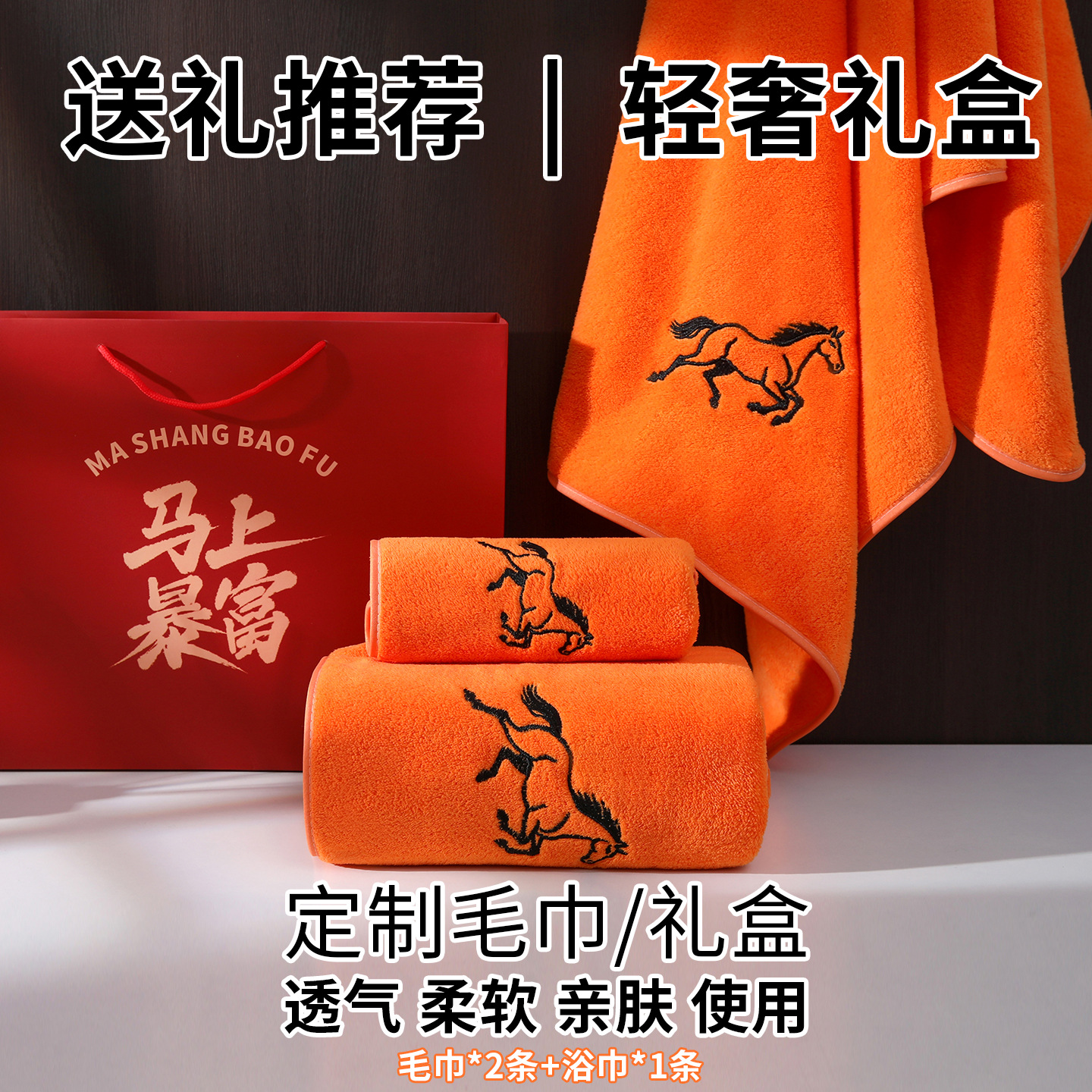 爱马橙色毛巾浴巾礼盒三件套公司员工年会马年礼品绣字毛巾定LOGO