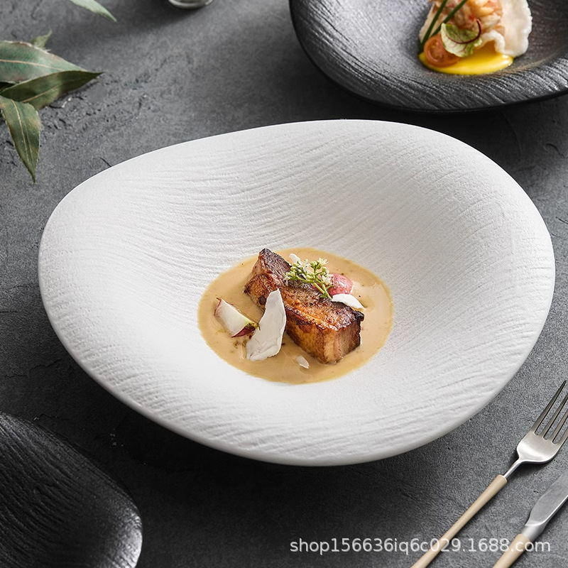 岩紋陶磁器皿家庭用深皿料理皿創意ホテルレストラン食器高級感白皿スープ皿