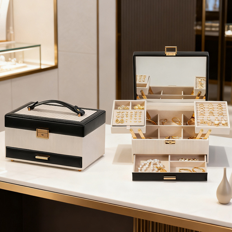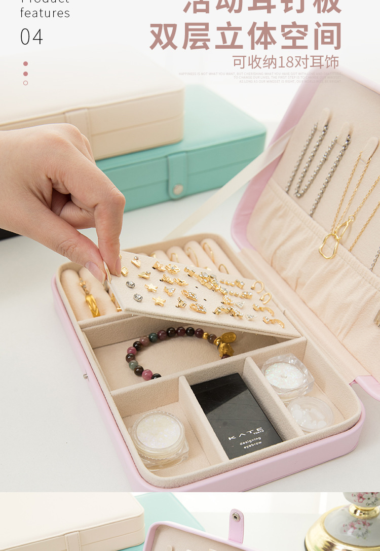 新款皮革首饰收纳盒带镜子多功能便携珠宝耳钉戒指项链首饰盒现货