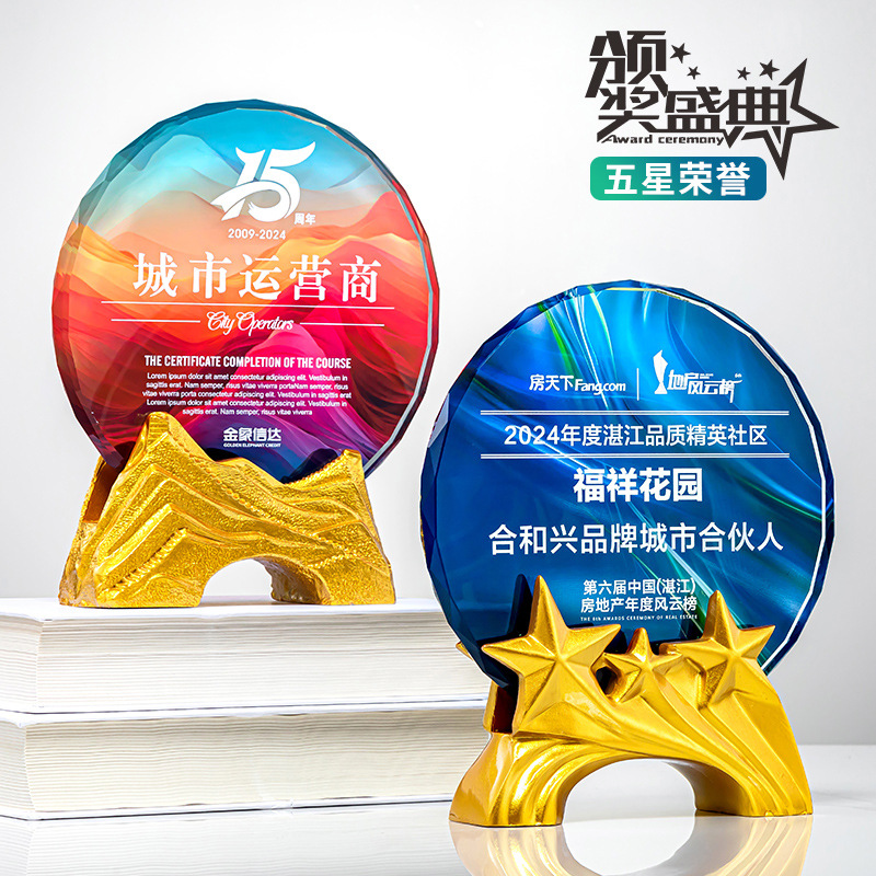 クリスタルトロフィー企業イベントスポーツゲーム金属トレーニング証明書機関賞五芒星金属メッキゴールドトロフィー
