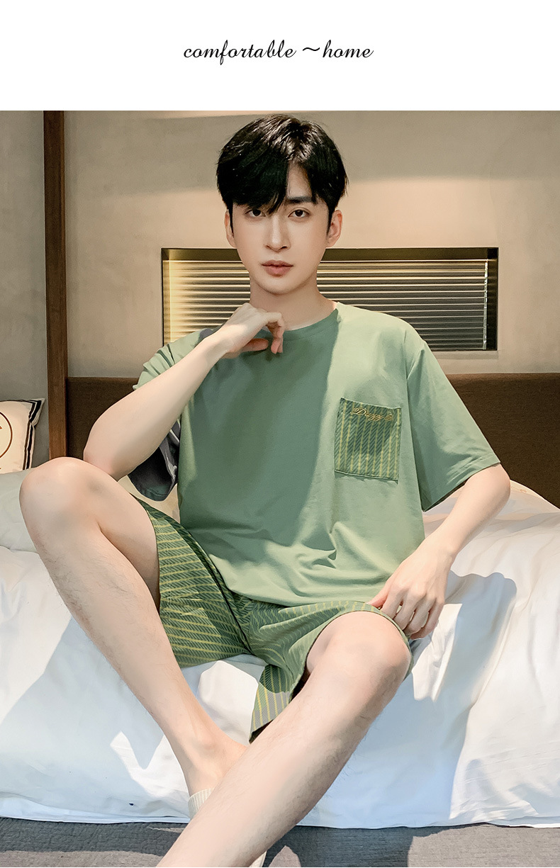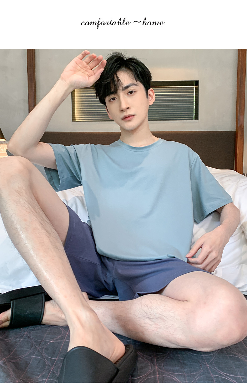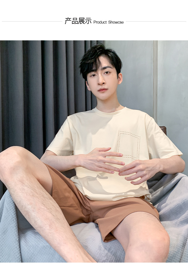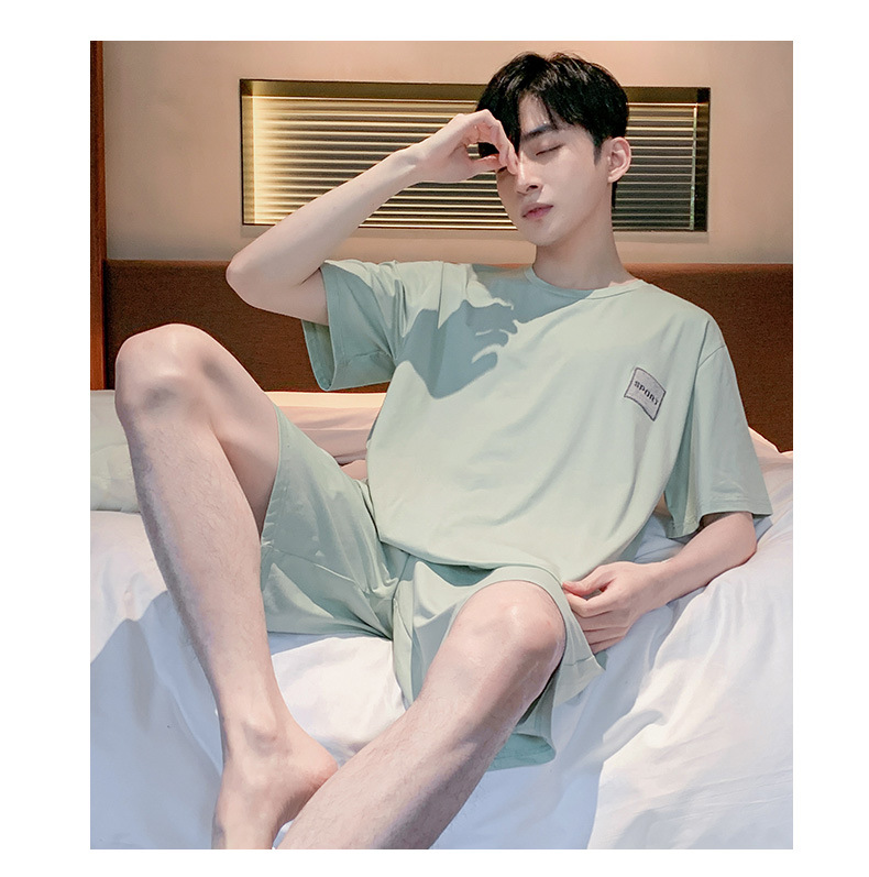 半袖パジャマ男性夏の薄いモデルのモデル綿の涼しさは、純色の半ズボンの大きいサイズの家庭服セットを着ることができます。