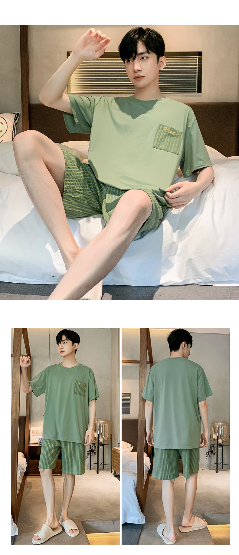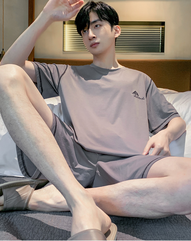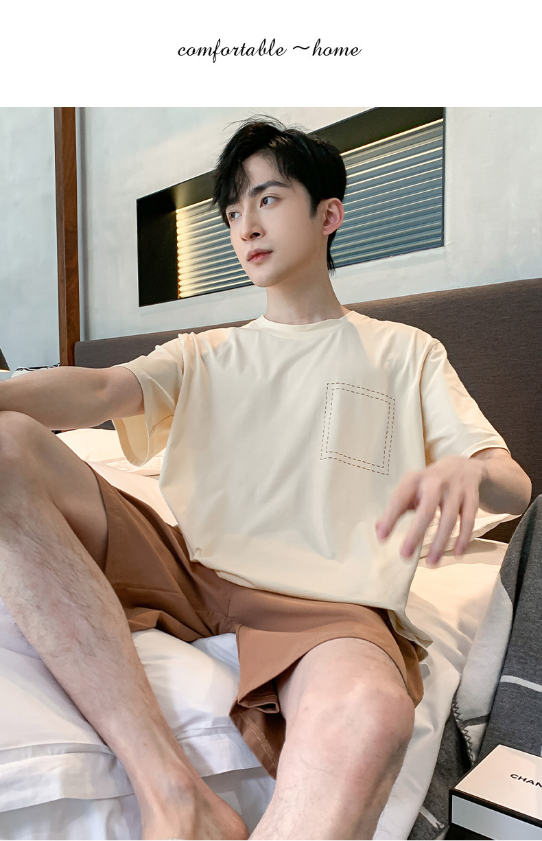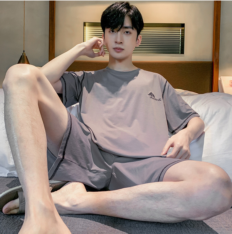 半袖パジャマ男性夏の薄いモデルのモデル綿の涼しさは、純色の半ズボンの大きいサイズの家庭服セットを着ることができます。