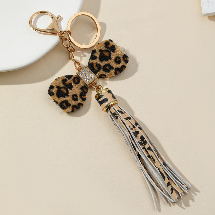 クロスボーダーebay新型ヒョウ柄蝶結びフリンジバッグストラップファッションアクセサリー革流蘇穂子キーホルダー