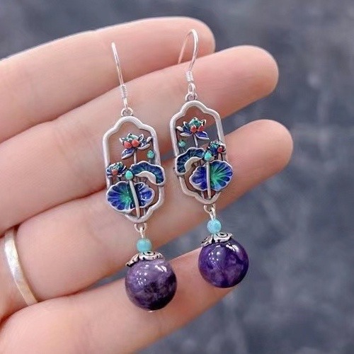 古代スタイルの新しい電気メッキスターリングシルバーイヤリングレトロ七宝工芸色釉蓮の葉天然アメジストシルバーイヤリング
