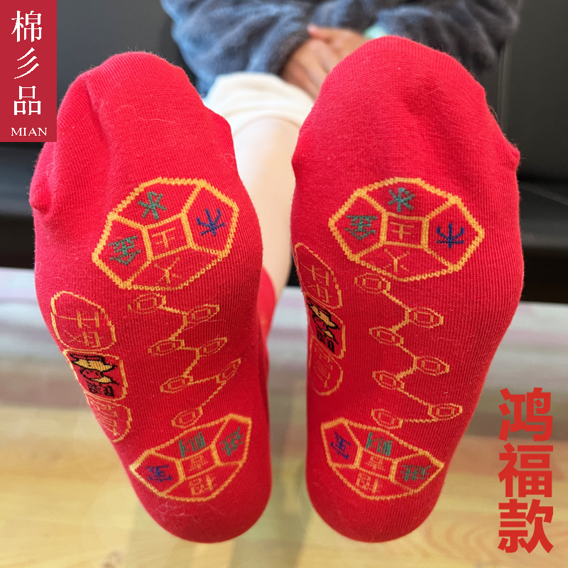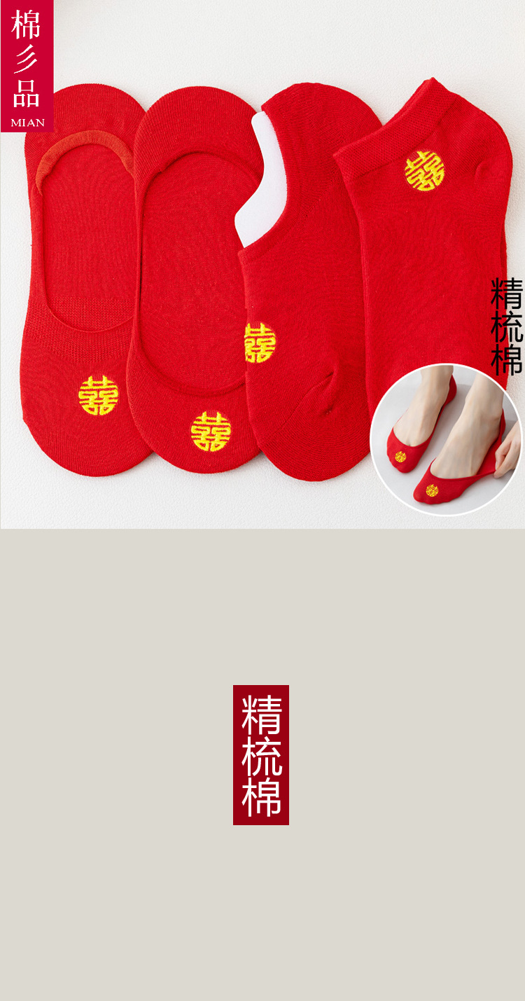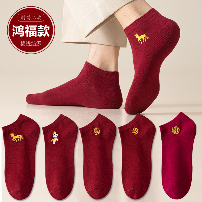红袜子本命年红色船袜男士女袜情侣属马年酒红色喜字结婚短袜棉袜