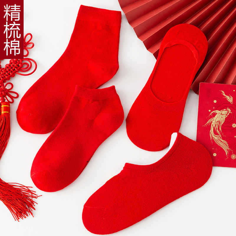 結婚式のカップル用の赤い靴下、女性用の赤い浅い靴下、花嫁のウェディングソックス、男性用の目に見えない干支年綿