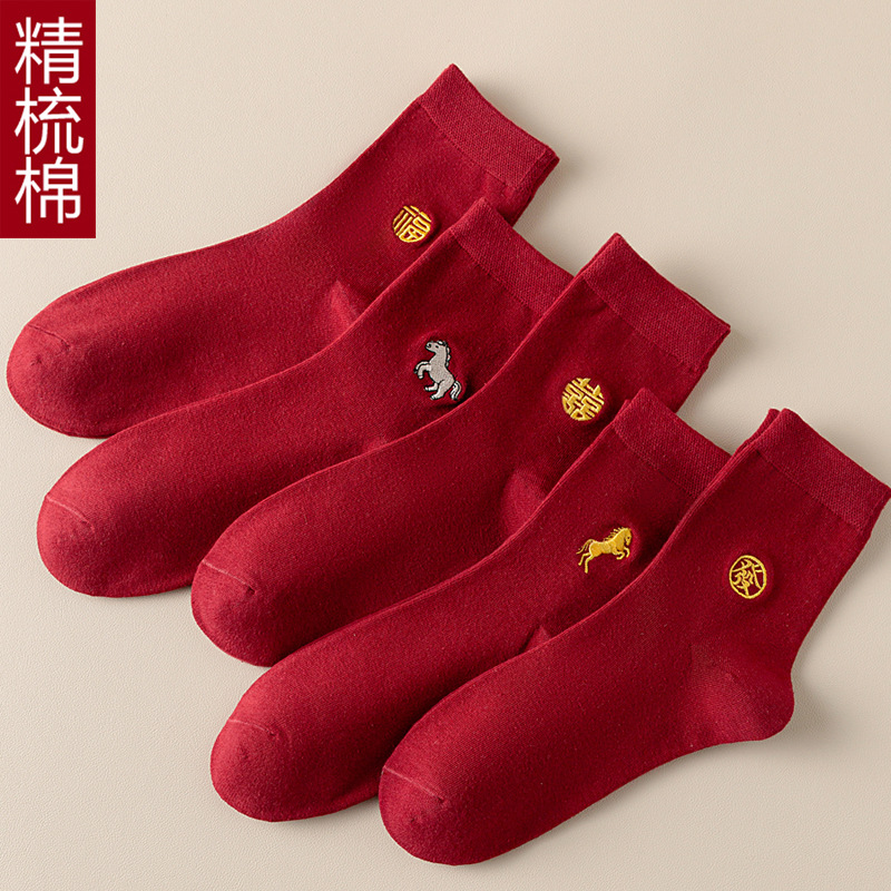 赤い靴下の男女のカップルの金の結婚の本命年の刺繍の喜字の福の字の中筒の靴下の赤い船の靴下の見えない靴下